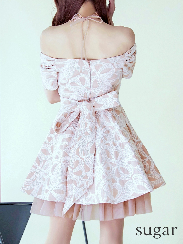 XS-Lサイズあり【Donia Quinn / ドニアクイーン】 オフショル/ 刺繍/ リボンモチーフ/ チョーカー付き/ バストシアー/ フレア/ ミニドレス/ キャバドレス[OF05]