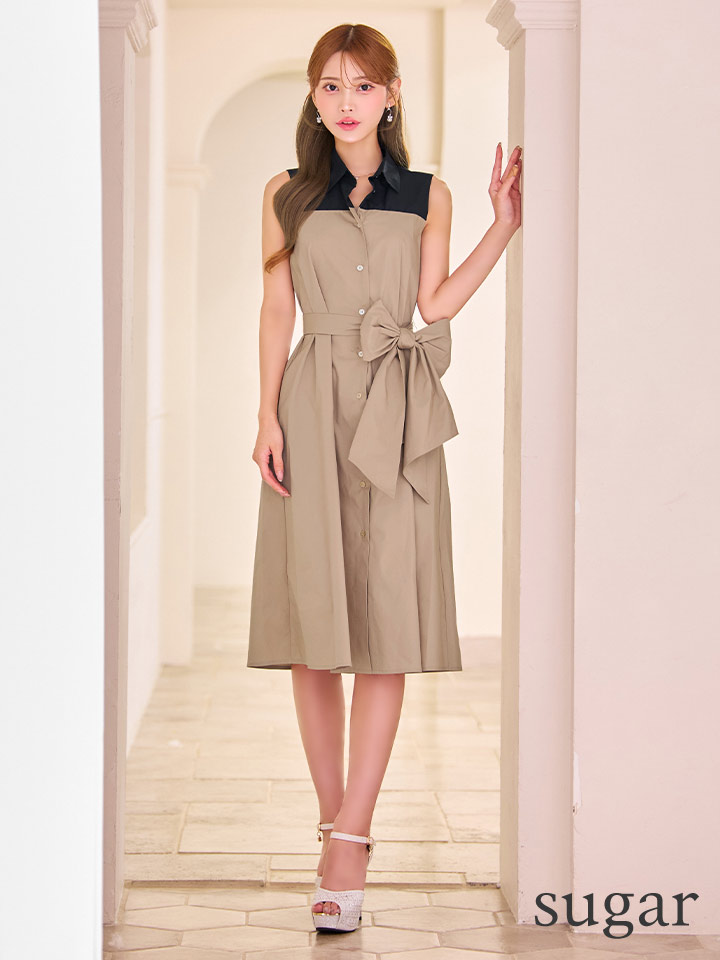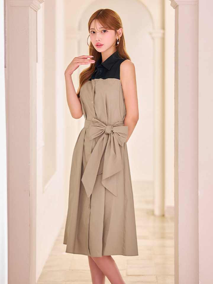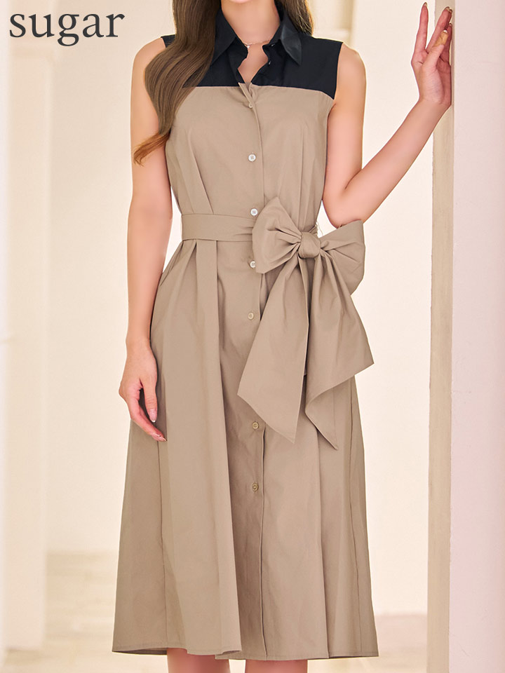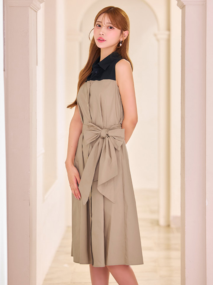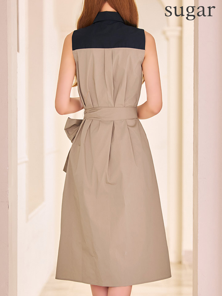 XS-Lサイズあり 【GINZA COUTURE/銀座クチュール】襟付き/バイカラー/ 切替/ ボタン/ ノースリーブ/ Aライン/ リボンベルト/ ミディアムドレス/ キャバドレス[OF2] [LKC36075-BxBE-S2511]