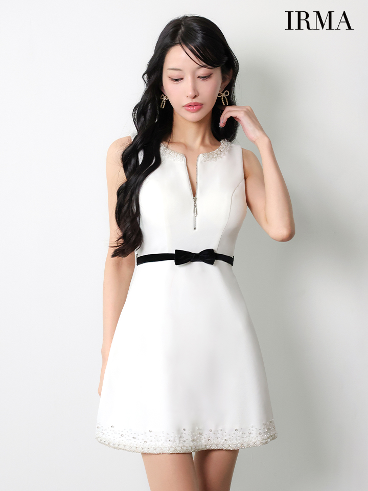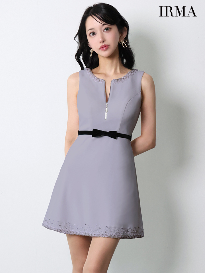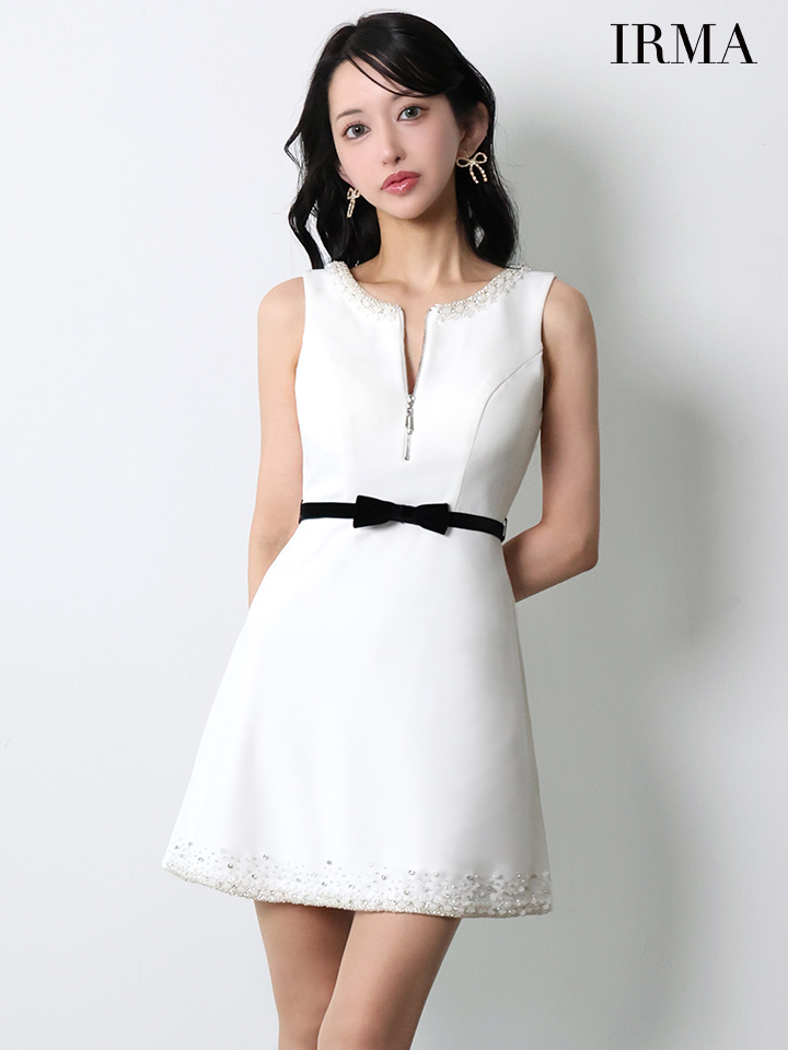 - > XSサイズあり【IRMA/イルマ】ビーズ刺繍/ リボンベルト/ ノースリーブ/ Aライン/ フレア/ ワンピース/ ミニドレス/ キャバドレス[OF2A]