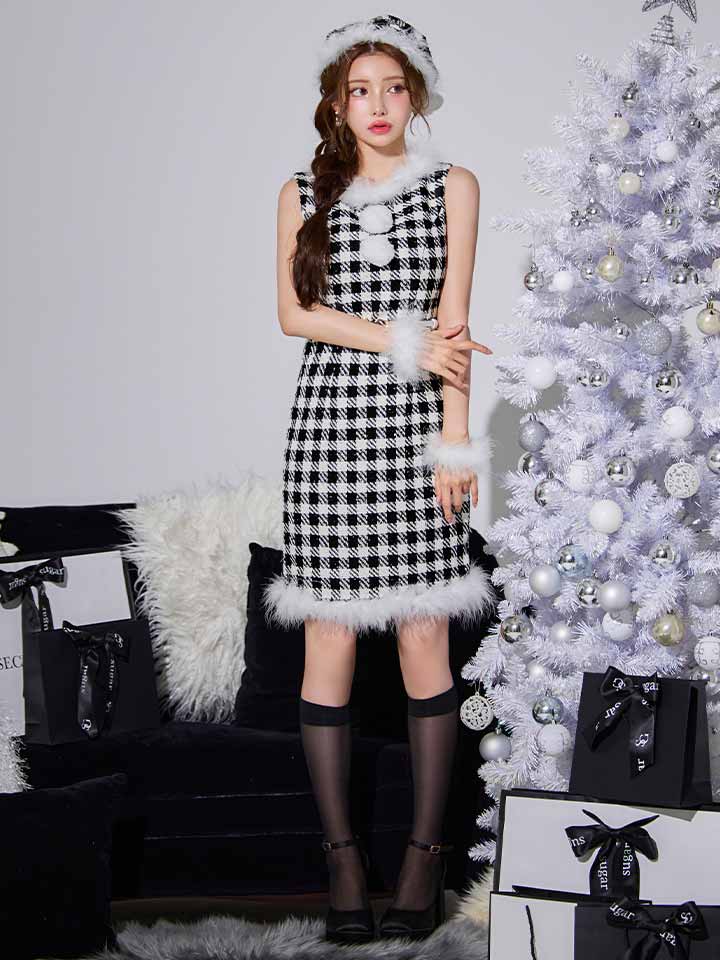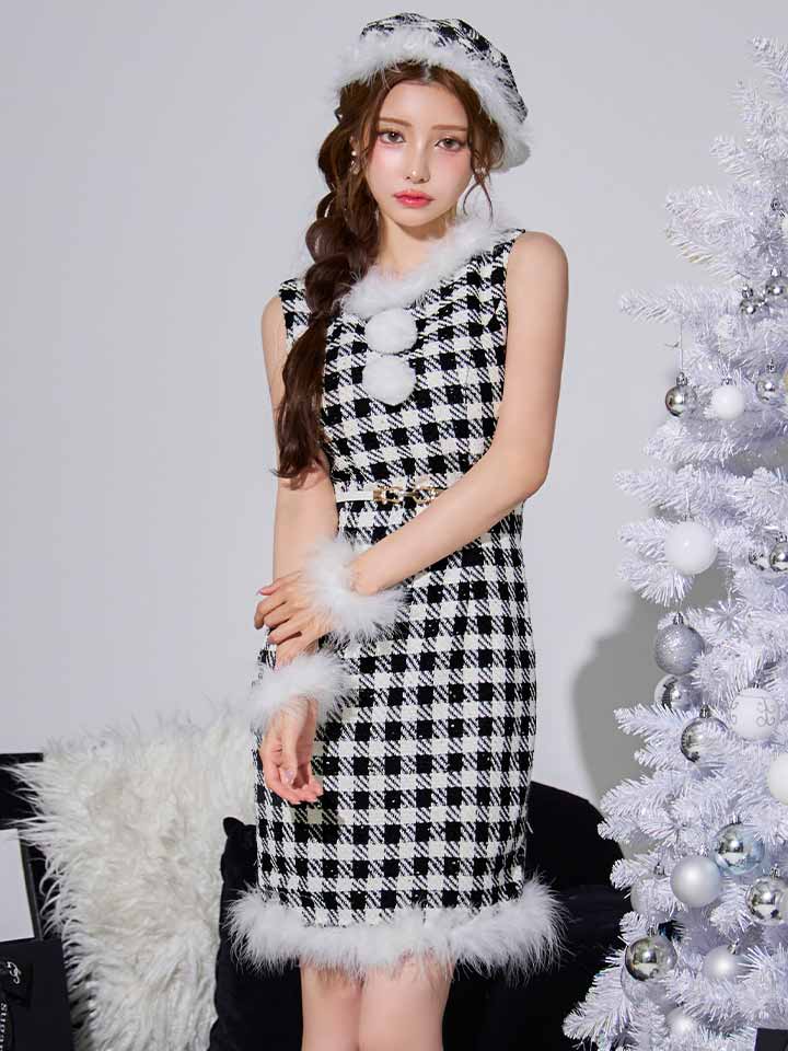 胸元隠し タイトスカート ファー ツイード チェック レッド ホワイト ミニ スカート