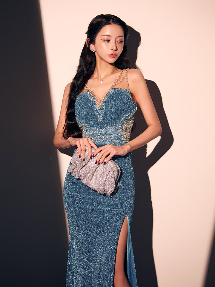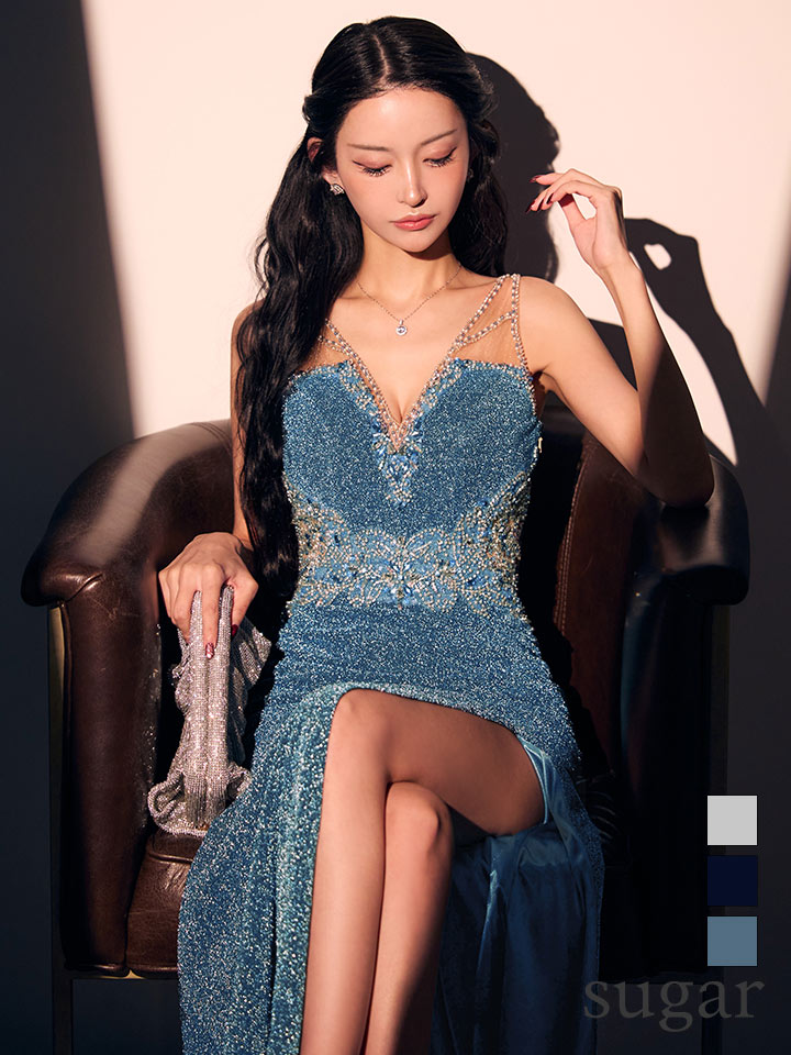 圧倒的な輝きを放つラメニットとビジューが視線を集めるロングドレス♡