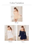 胸元のリボンとフリルが絶妙な甘さを添え、顔まわりを華やかに。