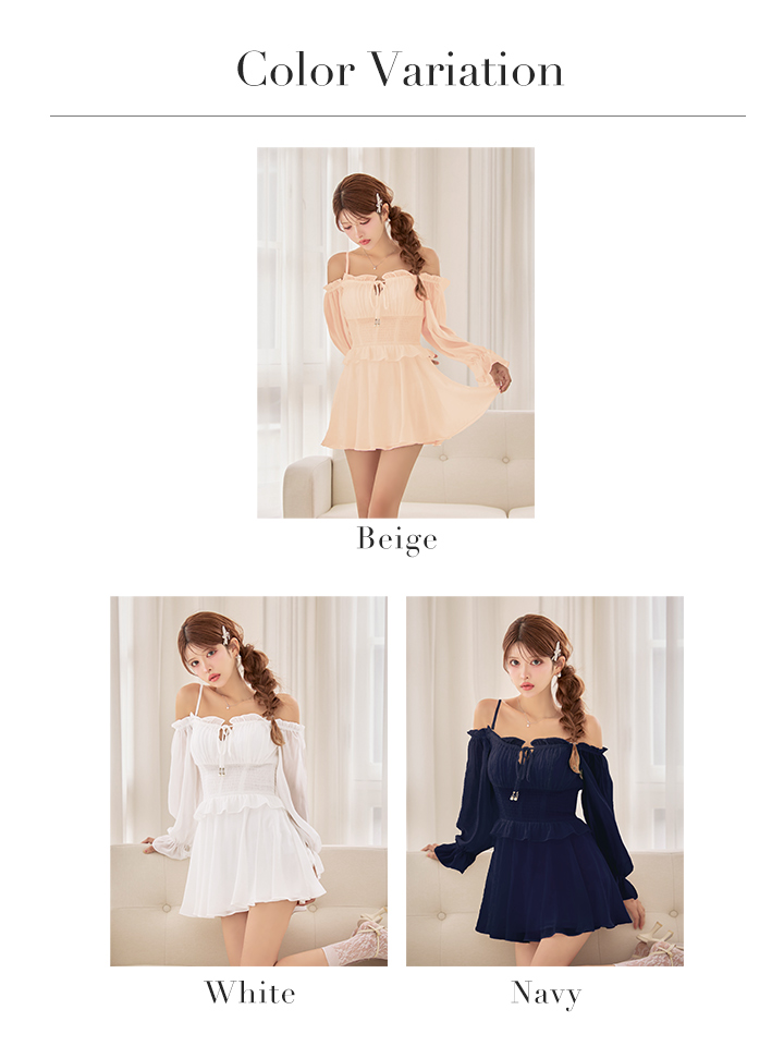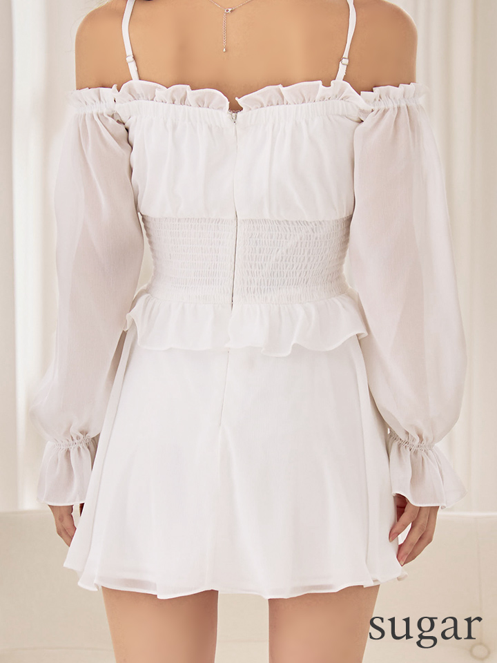XSサイズあり【ANGEL R/エンジェルアール】オフショルダー/ ロングスリーブ/ ウエストシャーリング/ フロントリボン/ フリル/ シフォン/ パール/ フレア/ マイクロミニドレス/ キャバドレス[OF2] [AR25867-W-S251118]