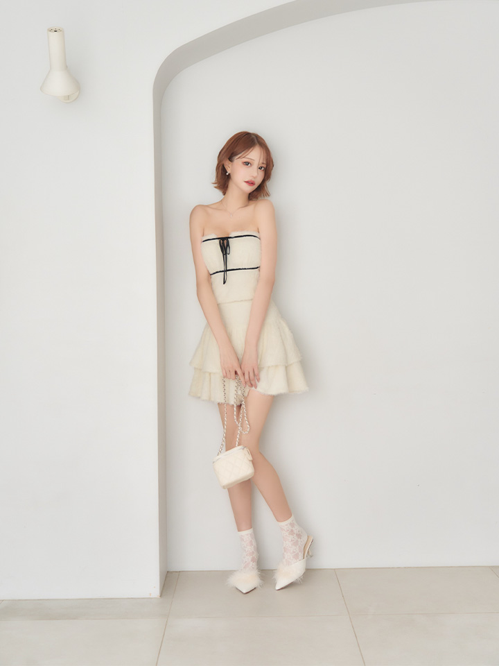 胸元とスカートにデザインされたリボンとフリルがガーリーなミニドレス。