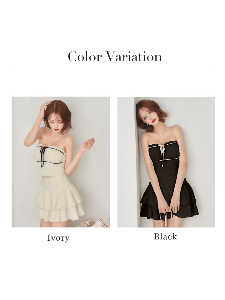 トップスはシンプルなベアトップデザインで、アクセサリーが映えます。