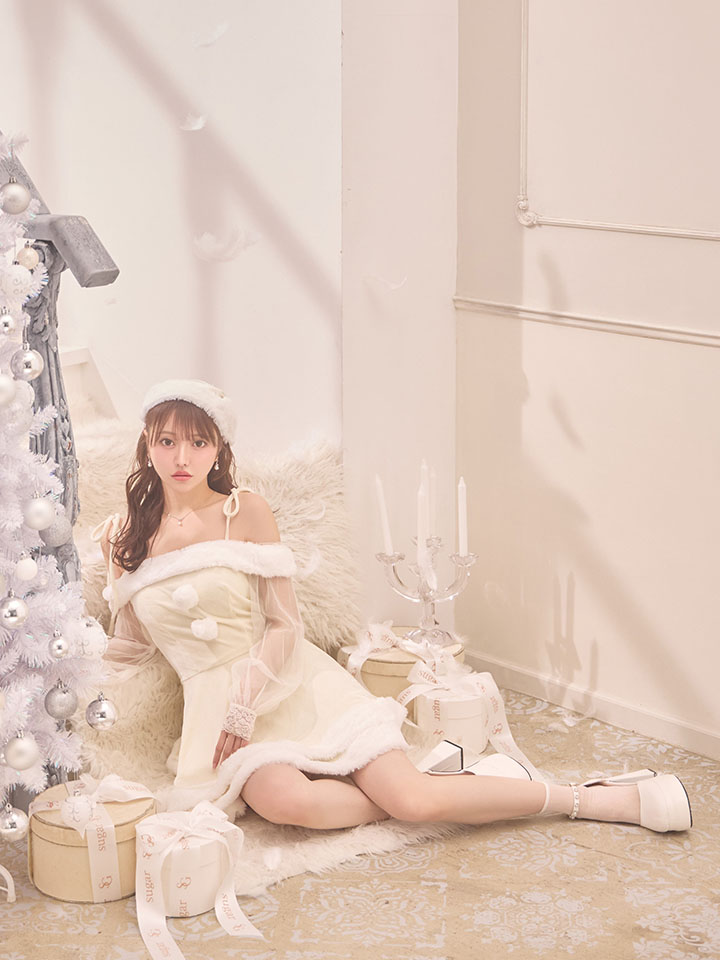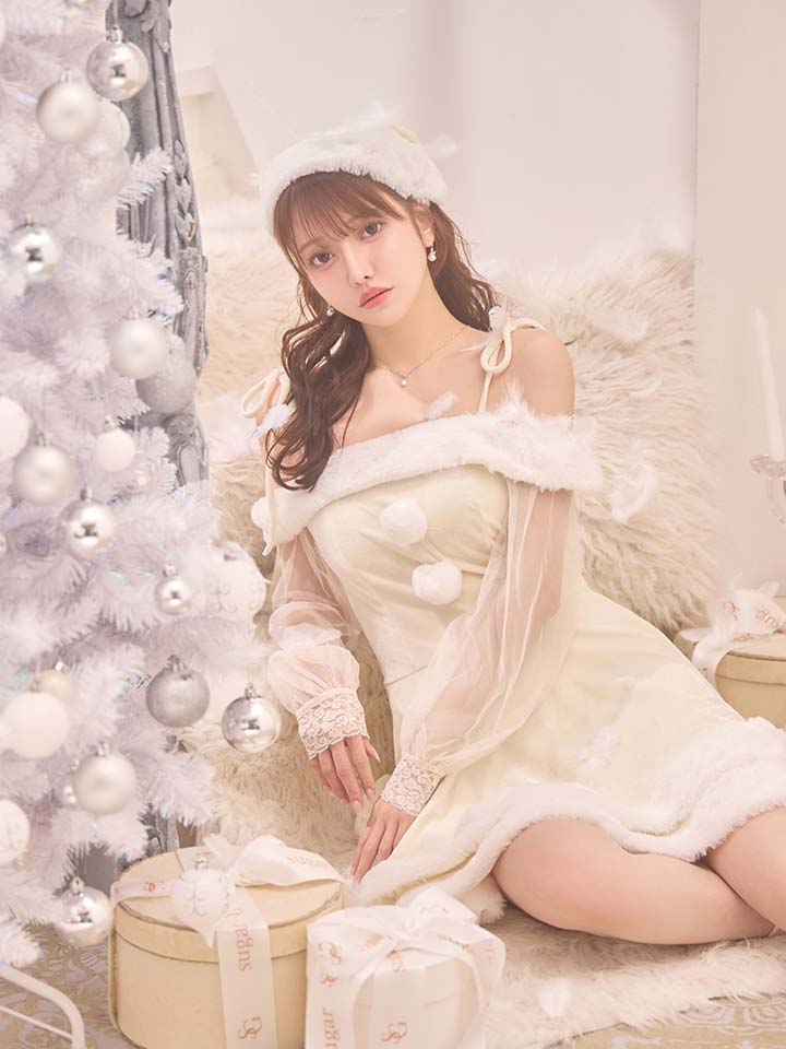 #オフショルダー #ベロア #フレア #ミニスカート #ワンピース #クリスマス #パーティ #サンタコス #サンタさん #ホワイト #袖あり