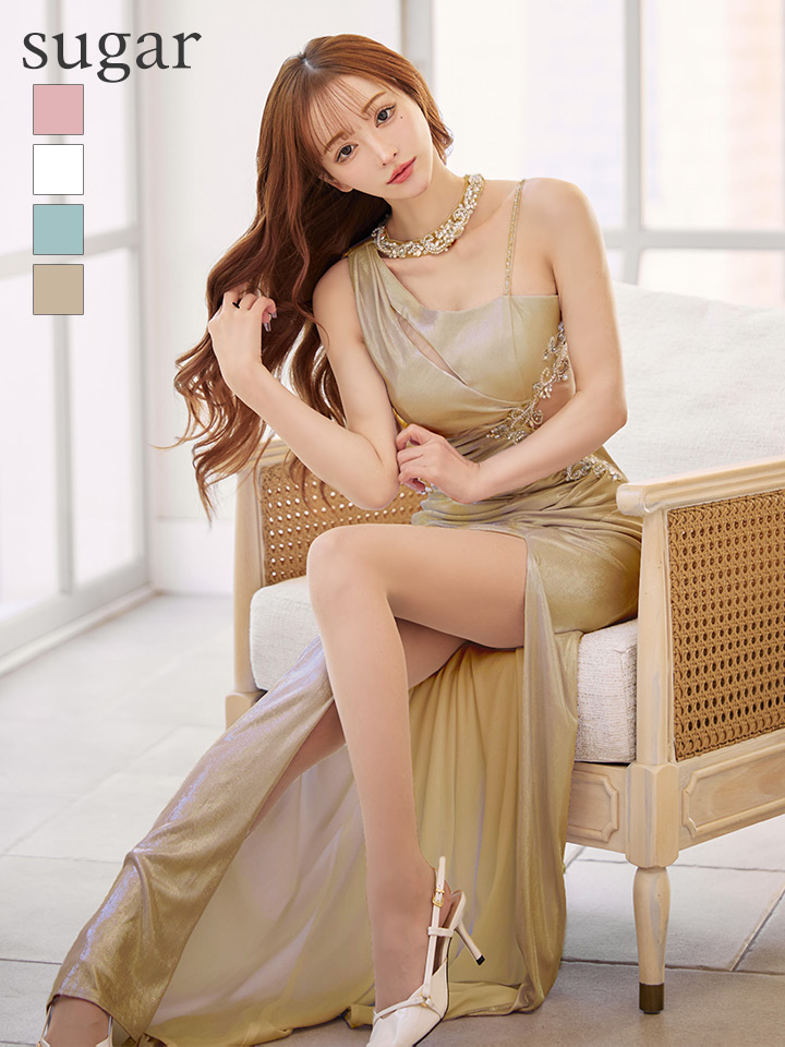 【Lip line/リップライン】アシンメトリーショルダー/ ラメ/ バストカット/ ウエストシアー/ ビジュー/ スリット/ ロングドレス/ キャバドレス long[HC03]