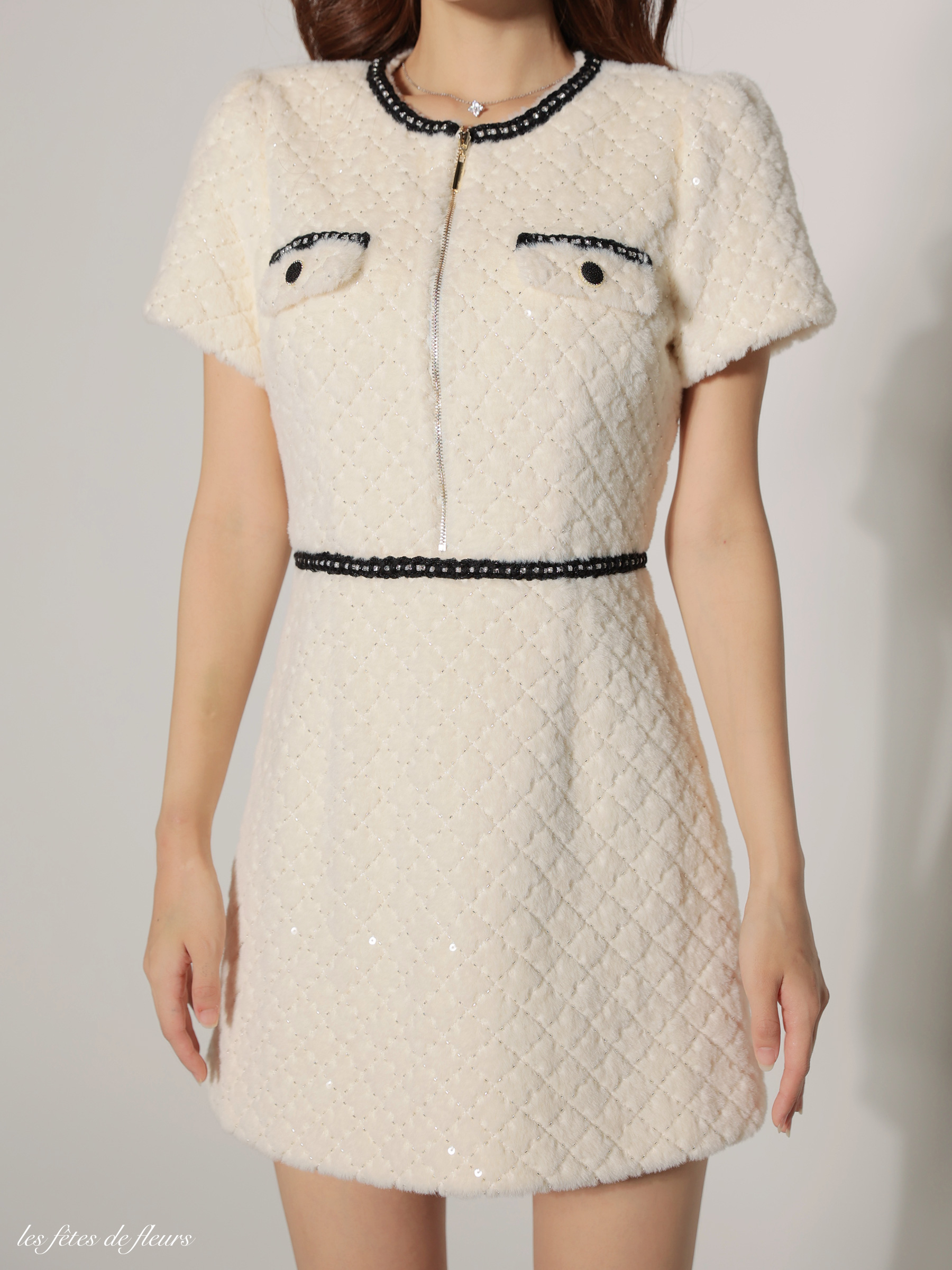 上品なラメ糸を織り込んだツイード調のニット素材を使用したミニドレス。