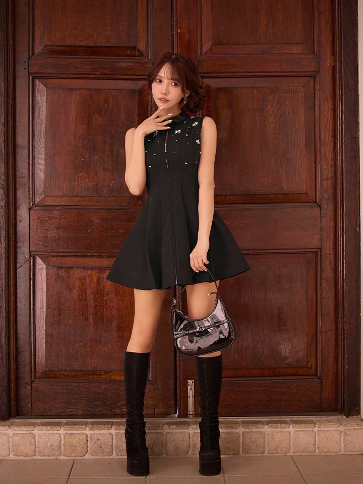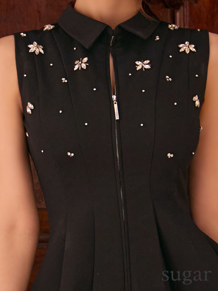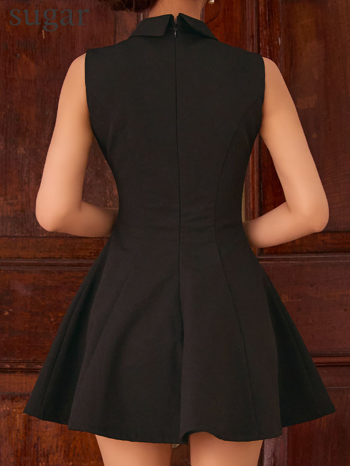 クラシカルな襟付きデザインが上品で知的な印象を与える、ノースリーブミニドレス。