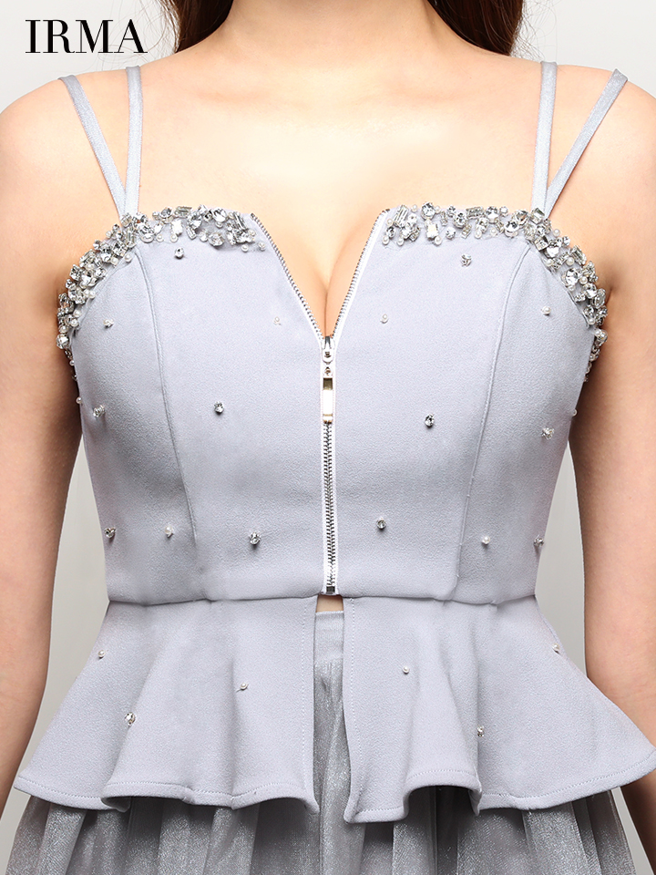 XSサイズあり【IRMA/イルマ】ダブルストラップ/ フロントジップ/ ビジュー/ キャミソール/ フリル/ フレア/ セットアップ/ ミニドレス/ キャバドレス[OF2A]