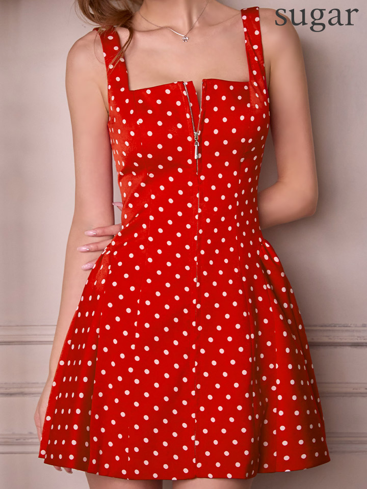 XS-Lサイズあり【ERUKEI エルケイ】ドット柄/ フロントジップ/ ノースリーブ/ バックスピンドル/ Aライン/ フレア/ ワンピース/ ミニドレス/ キャバドレス[OF2]