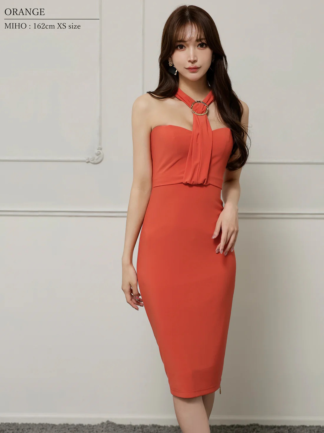 XSサイズあり【Veautt/ヴュート】 ホルターネック/ リング/ ドレープ/ ウエストマーク/ サイドファスナー/ タイト/ ミディアムドレス/ キャバドレス[OF2]