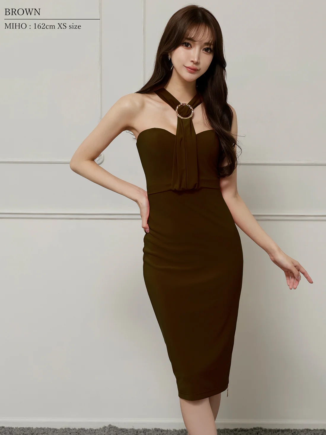XSサイズあり【Veautt/ヴュート】 ホルターネック/ リング/ ドレープ/ ウエストマーク/ サイドファスナー/ タイト/ ミディアムドレス/ キャバドレス[OF2] [VT082524-BR-S251127]