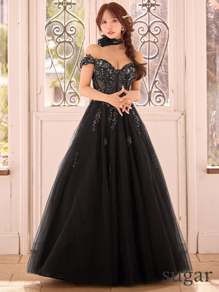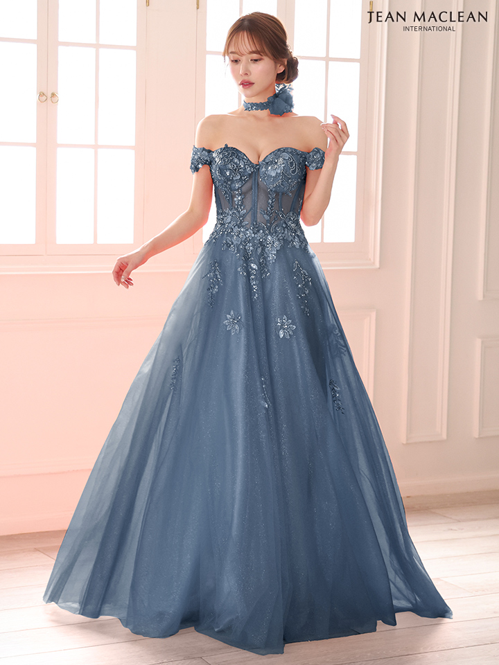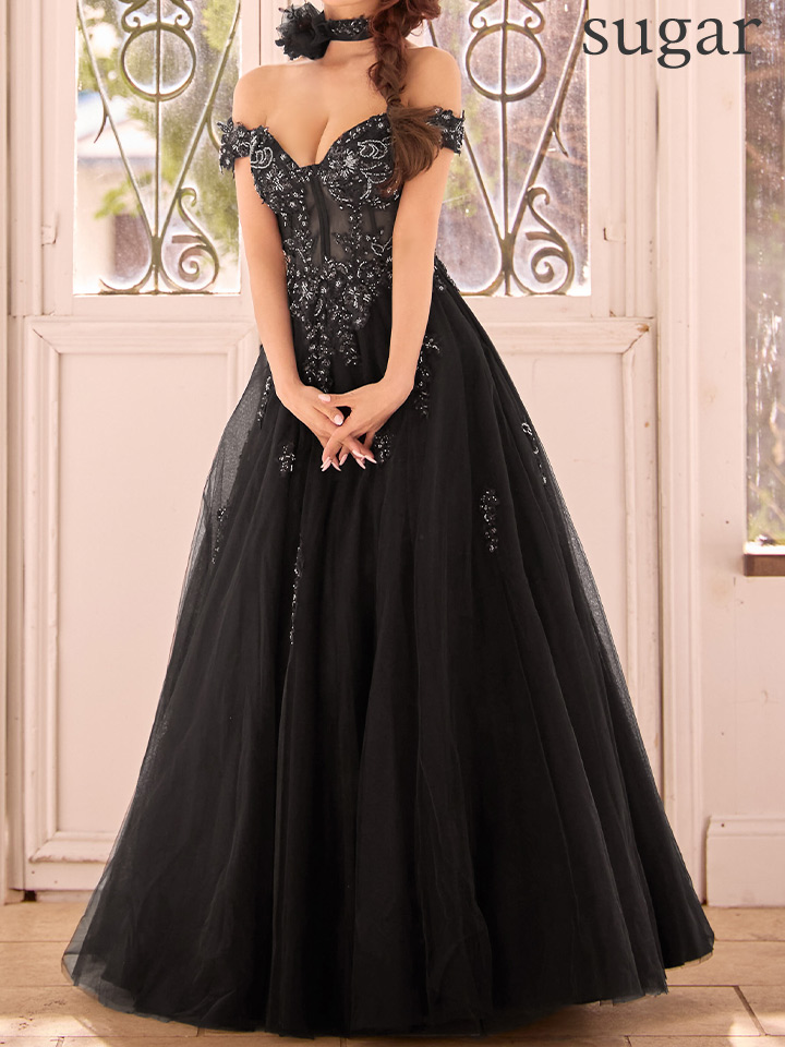 【JEAN MACLEAN/ジャンマクレーン】チョーカー付き/ オフショル/ シアー/ スパンコール/ レース/ フラワーモチーフ/ フレア/ Aライン/ プリンセス/ ロングドレス/ キャバドレス long[OF2A] [51979-JM-B-S251128]