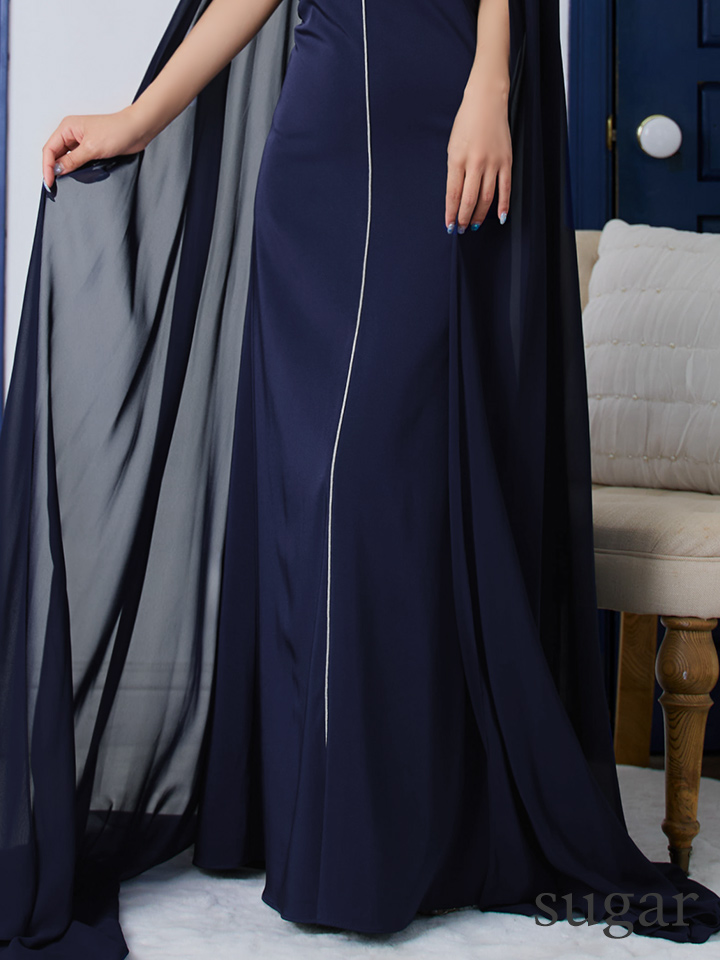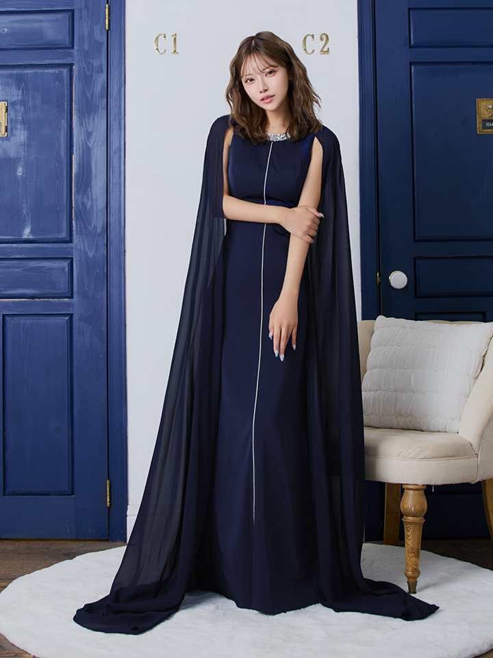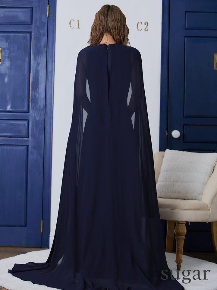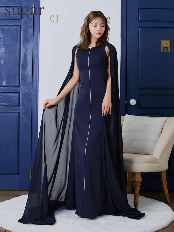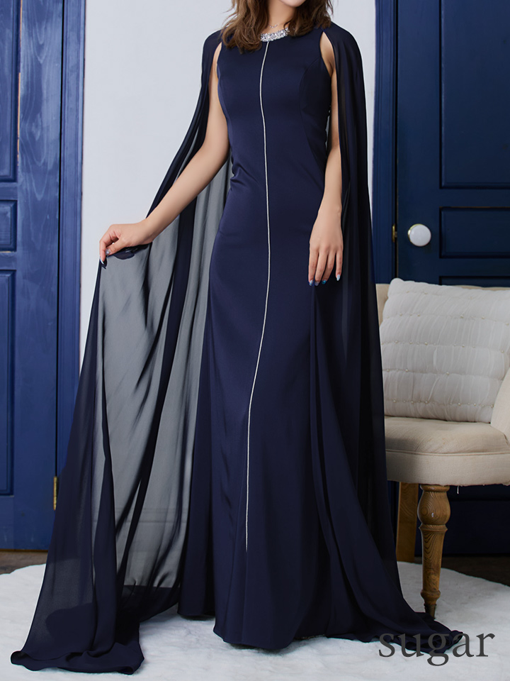 XS-Lサイズあり【SETTAN/セッタン】マント風ロングスリーブ/ シフォン/ ビジュー/ ノースリーブ/ シンプル/ Aライン/ ロングドレス / キャバドレス long[OF2] [LKS36507-NV-S2512]