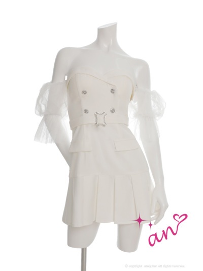 XSサイズあり【an /アン】チュールスリーブ付き/ 袖取り外し可能/ 2way/ ビジューボタン/ ベルト/ プリーツ/ フレア/ ベア/ ミニドレス/ キャバドレス[OF05] [AOC4024-W-2512]