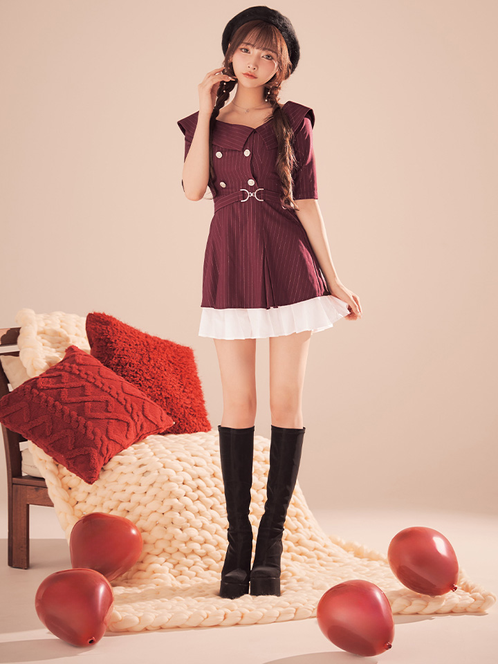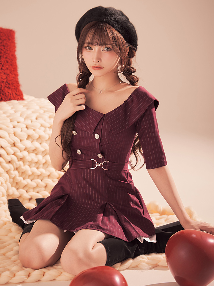 XSサイズあり【an /アン】ベルト/ オフショル/ ハーフスリーブ/ ストライプ/ ボタン/ フレア/ ワンピース/ ミニドレス/ キャバドレス[OF05]