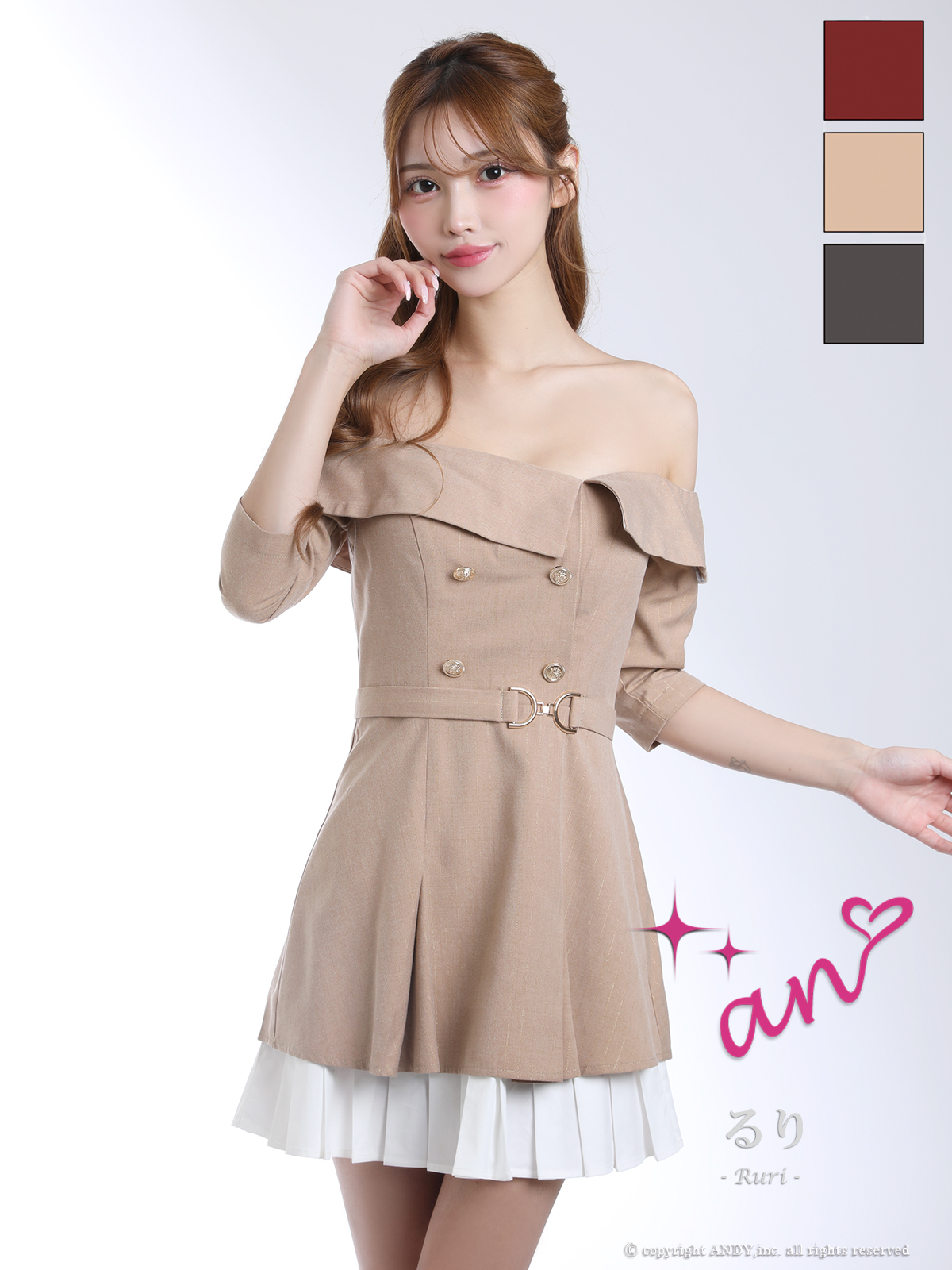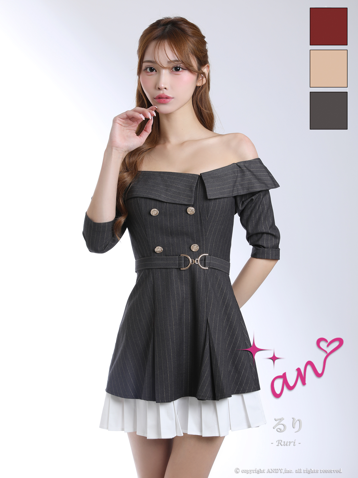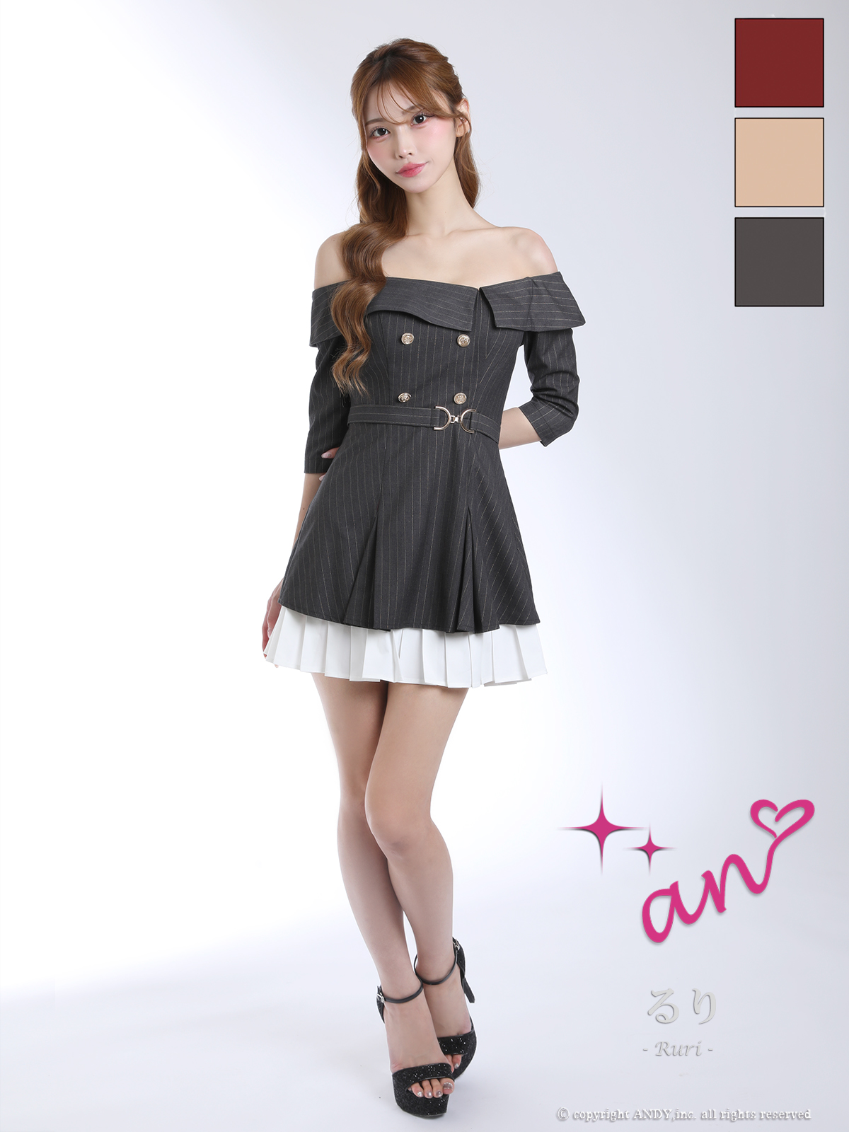 XSサイズあり【an /アン】ベルト/ オフショル/ ハーフスリーブ/ ストライプ/ ボタン/ フレア/ ワンピース/ ミニドレス/ キャバドレス[OF05] [AOC4018-BE-S251209]