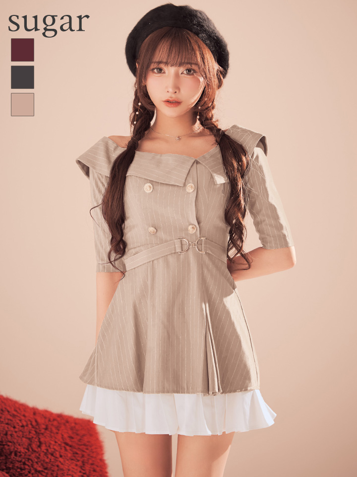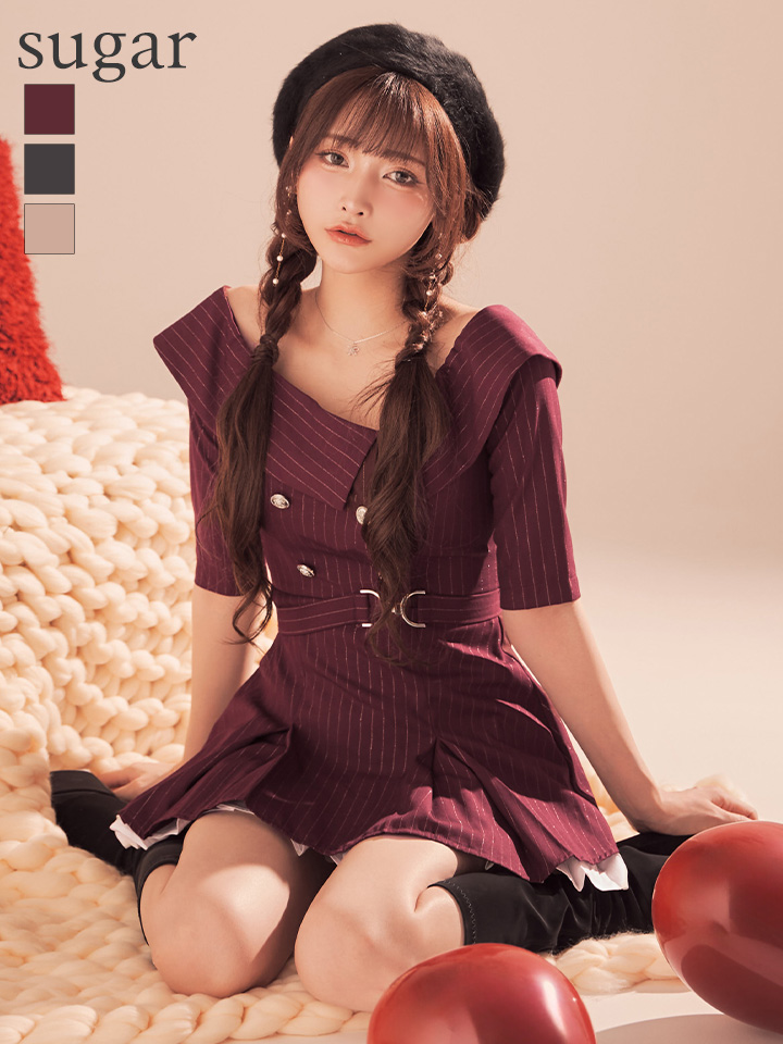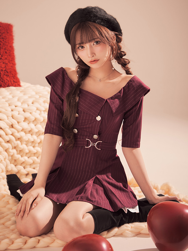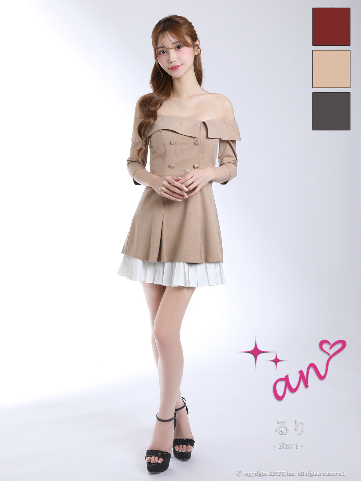 XSサイズあり【an /アン】ベルト/ オフショル/ ハーフスリーブ/ ストライプ/ ボタン/ フレア/ ワンピース/ ミニドレス/ キャバドレス[OF05] [AOC4018-BE-S251209]