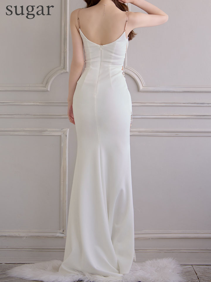 胸元からウエストにかけてあしらわれたビジューが、立体的に輝きを放つ華やかなデザイン。