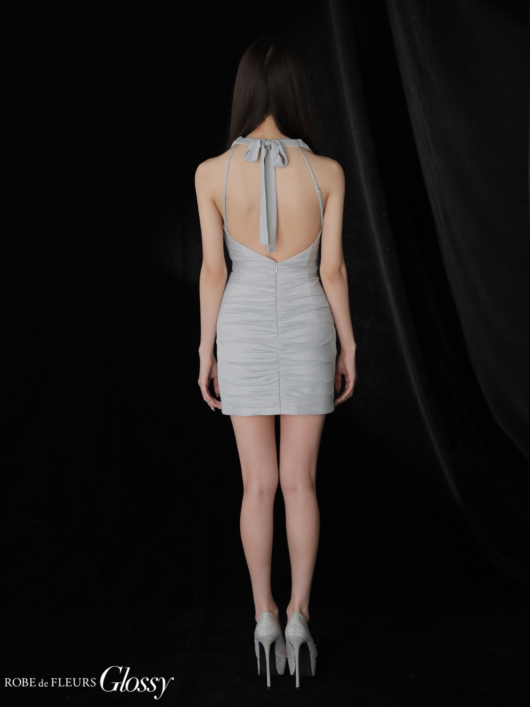 背中は大胆に開いたデザイン。ホルターネックのリボン結びが、隙のない色気を演出します。
