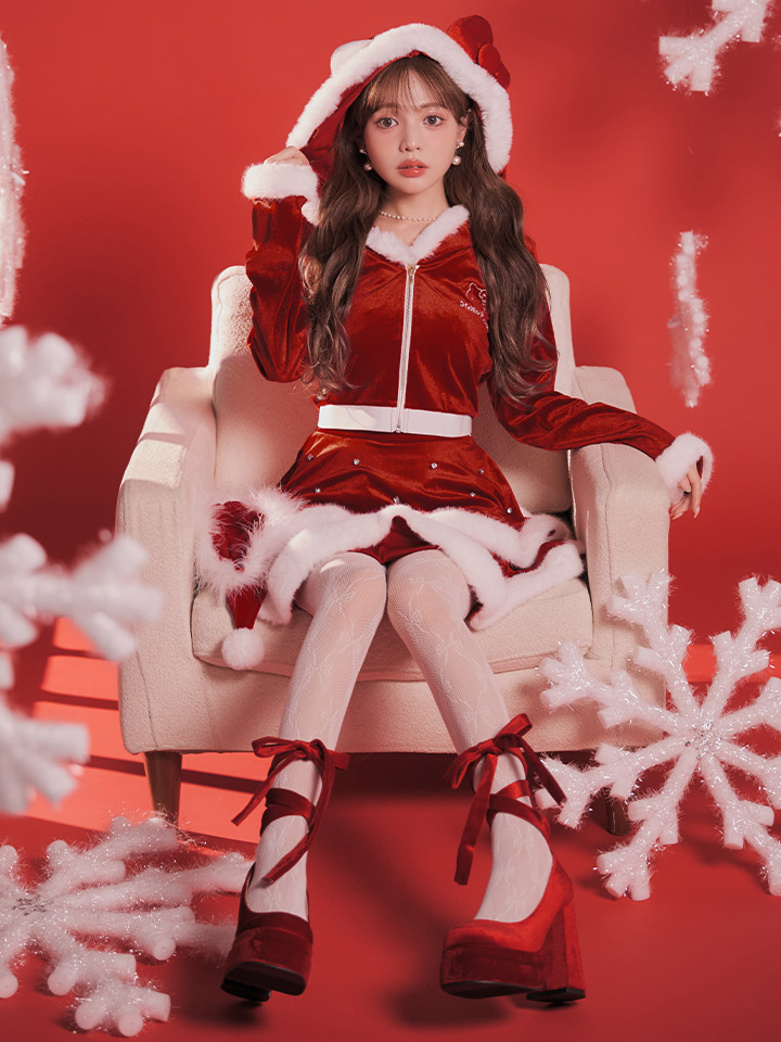 レッド 赤 セットアップ ビジュー ベロア フード スカート