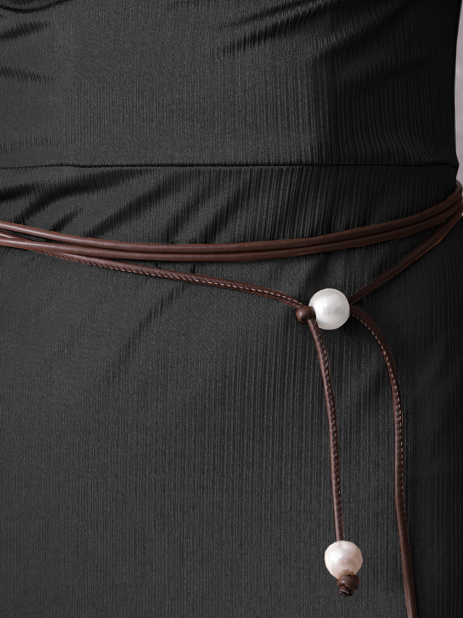 パールが連なる細ベルトがアクセントとなり、シンプルながら大人の高級感を演出します。
