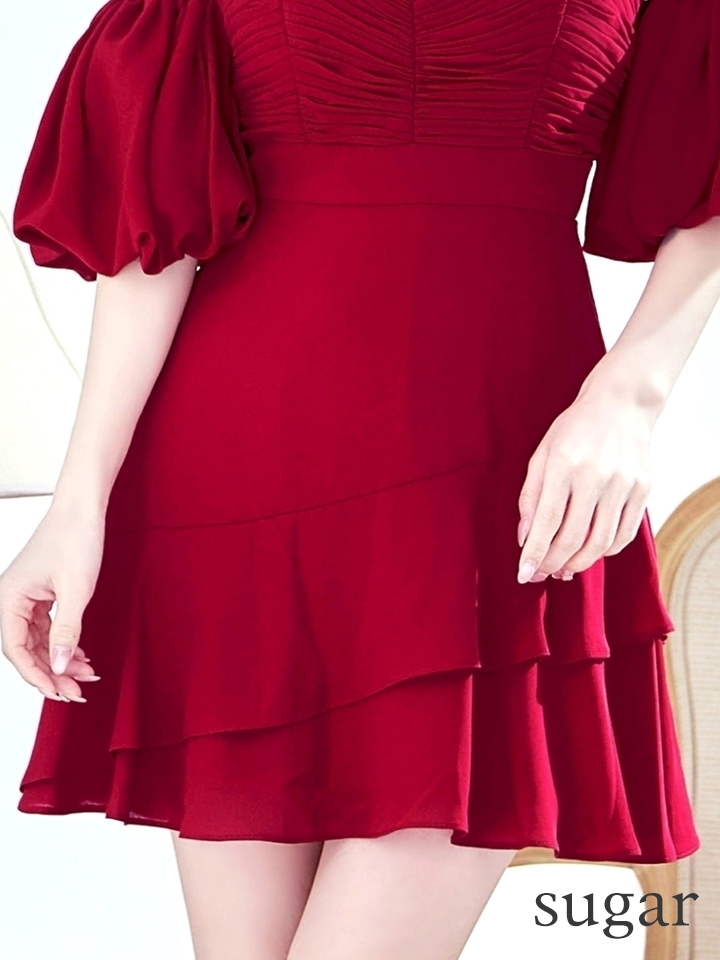 ギャザーがフェミニンなバストラインを引き立てるフレアミニドレス♡