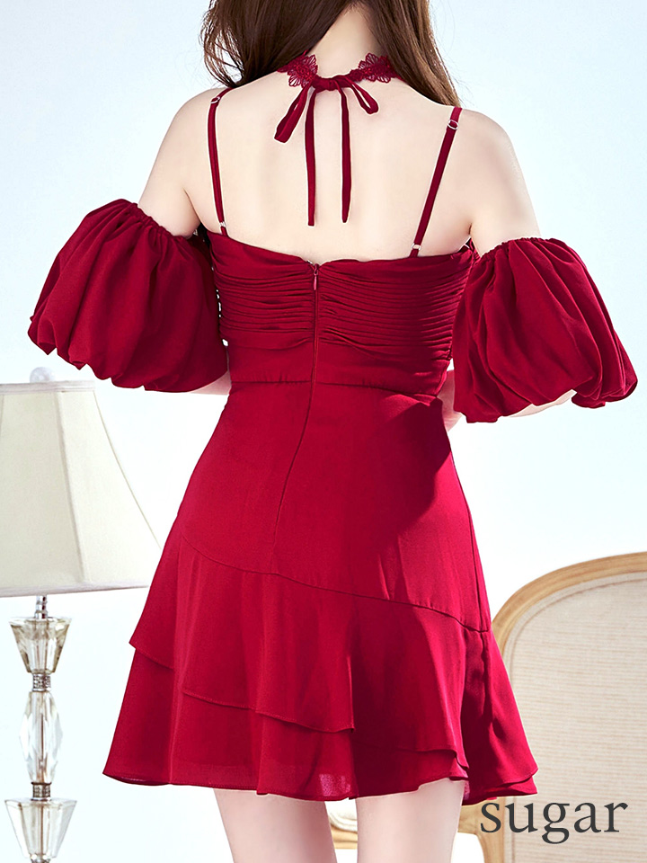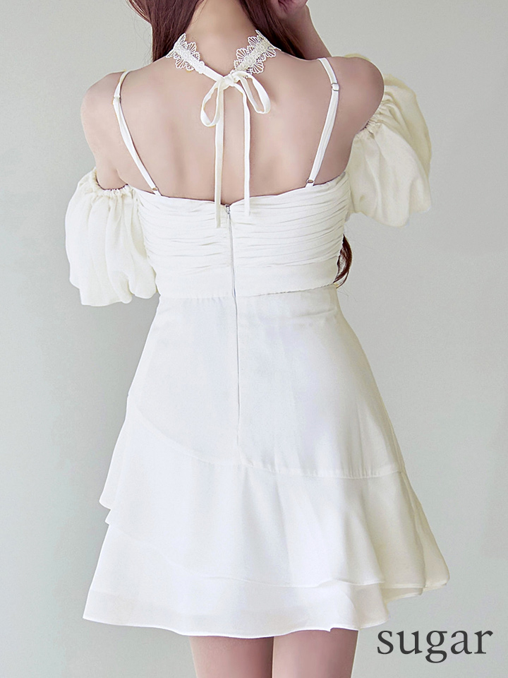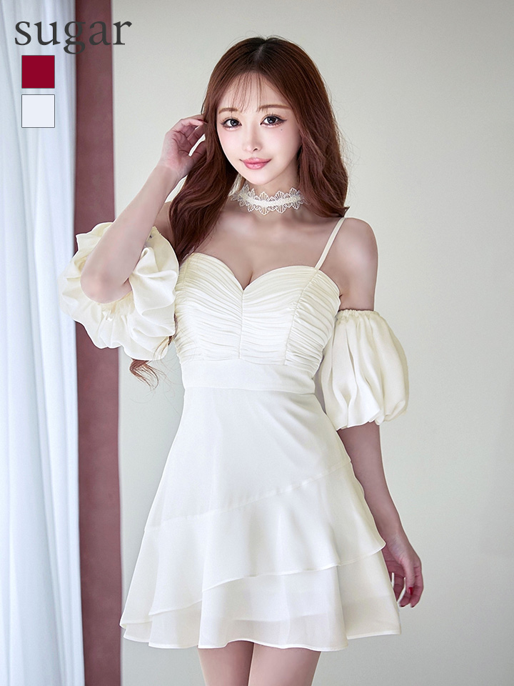 - > XS-Lサイズあり【Donia Quinn / ドニアクイーン】 チョーカー付き/ 2way/ ハーフスリーブ/ キャミソール/ オフショル/ ティアード/ バストギャザー/ フレア/ ミニドレス/ キャバドレス[OF05]