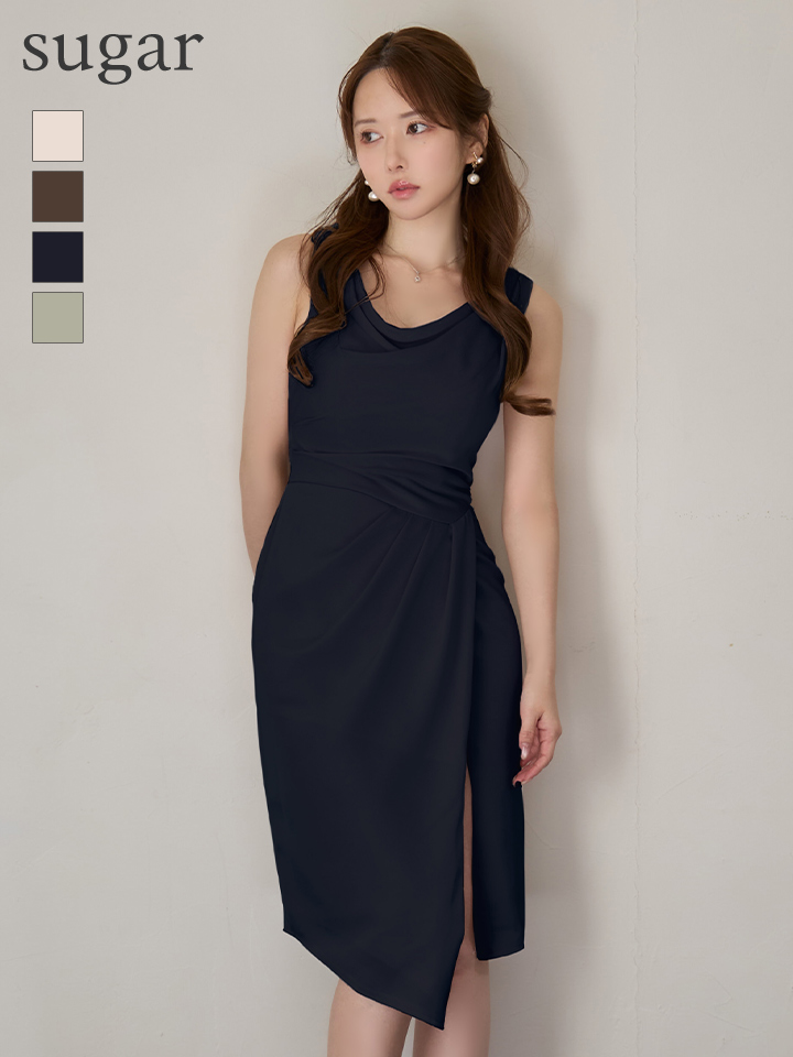 【予約商品/12月上旬-12月中旬発送予定】XSサイズあり【Veautt/ヴュート】【OF05】ドレープ/ ショルダーパーツ/ タック/ タイト/ ミディアムドレス/ キャバドレス [VT082530-NV-S251210]