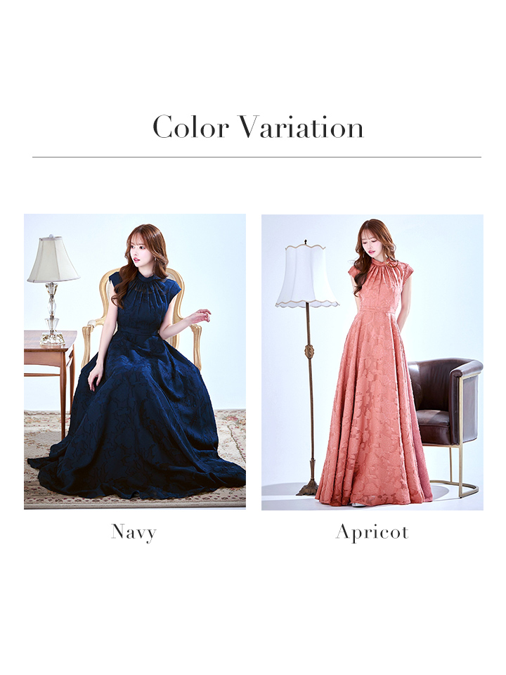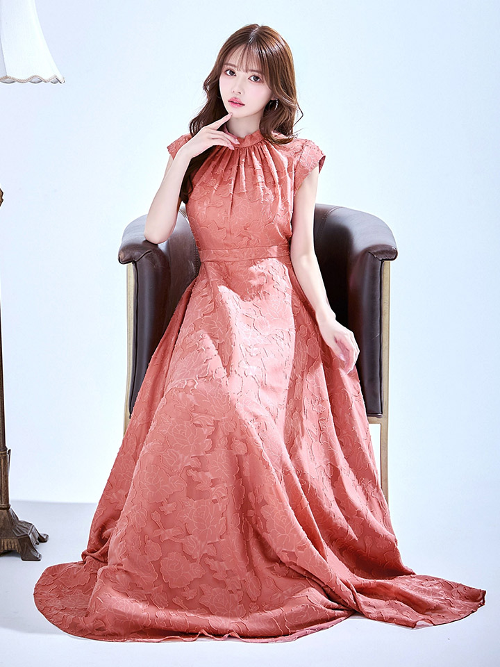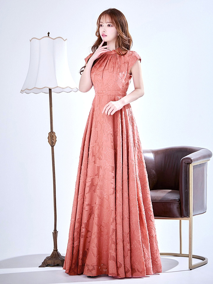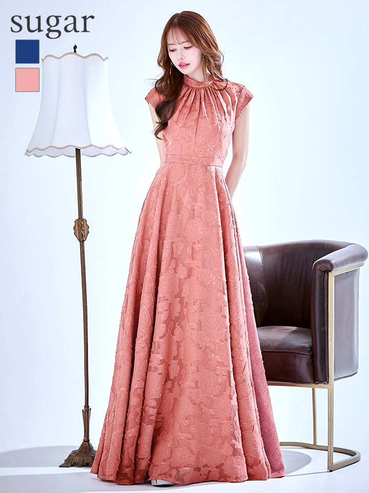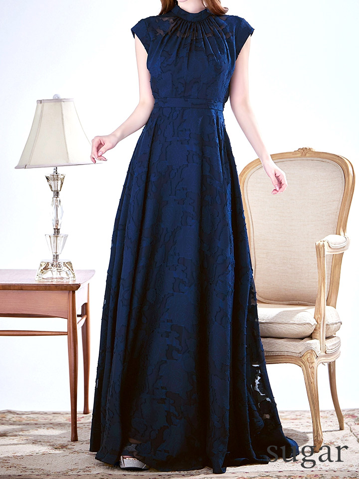 ハイネックにフレンチスリーブがフェミニンで印象的なフレアロングドレス♡