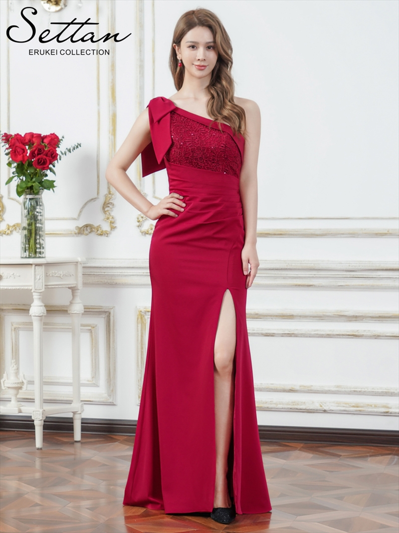 XS-Lサイズあり【SETTAN/セッタン】ワンショルダー/ サテン/ レース/ スパンコール/ リボン/ スリット/ ウエストタック/ ロングドレス / キャバドレス long[OF2]