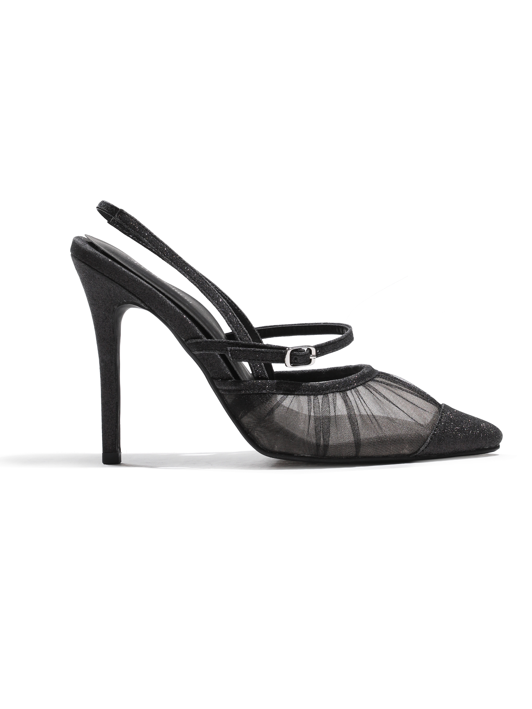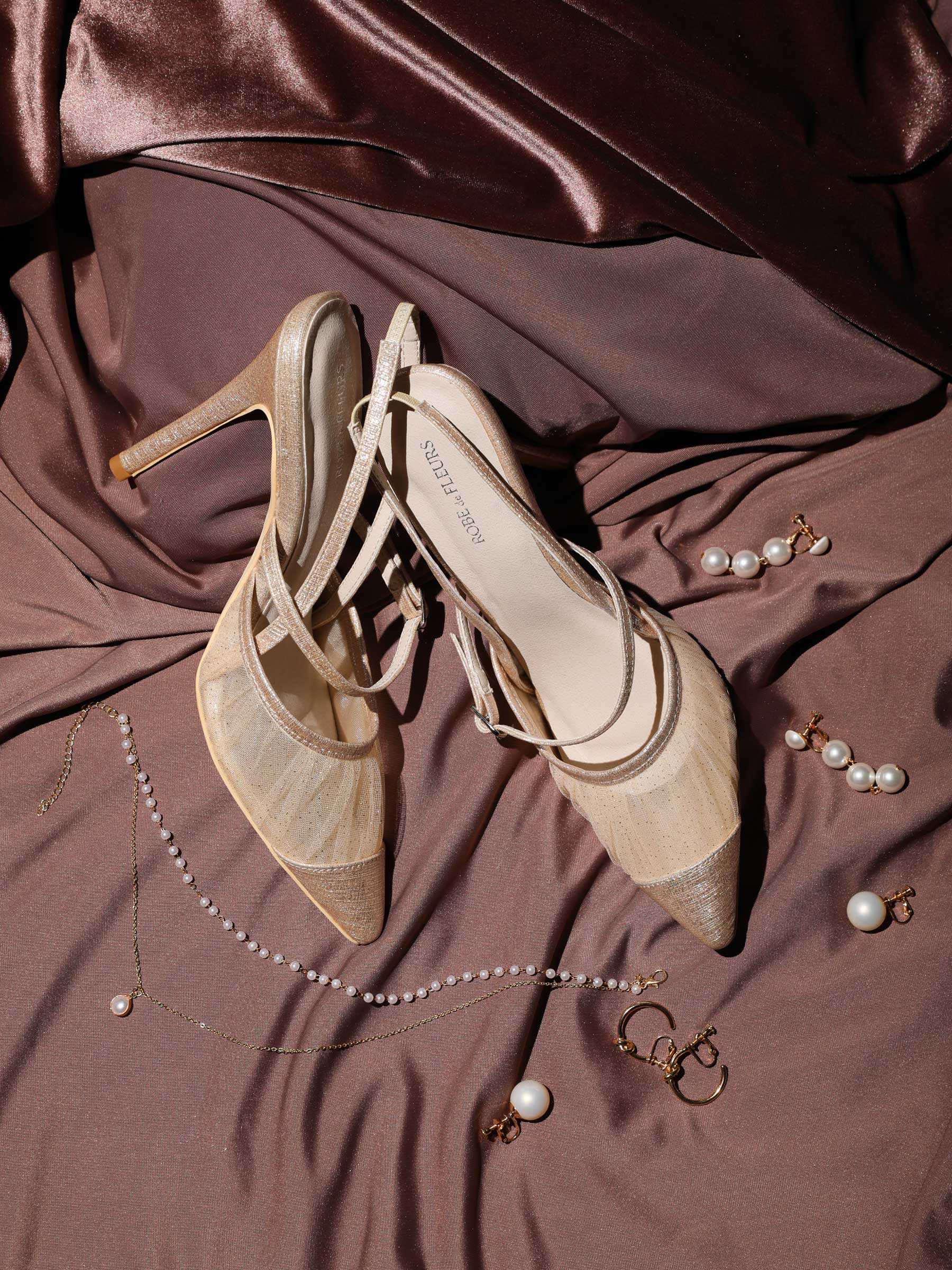 繊細なシアーチュール素材を重ねた、優雅で洗練されたポインテッドトゥパンプスです。
