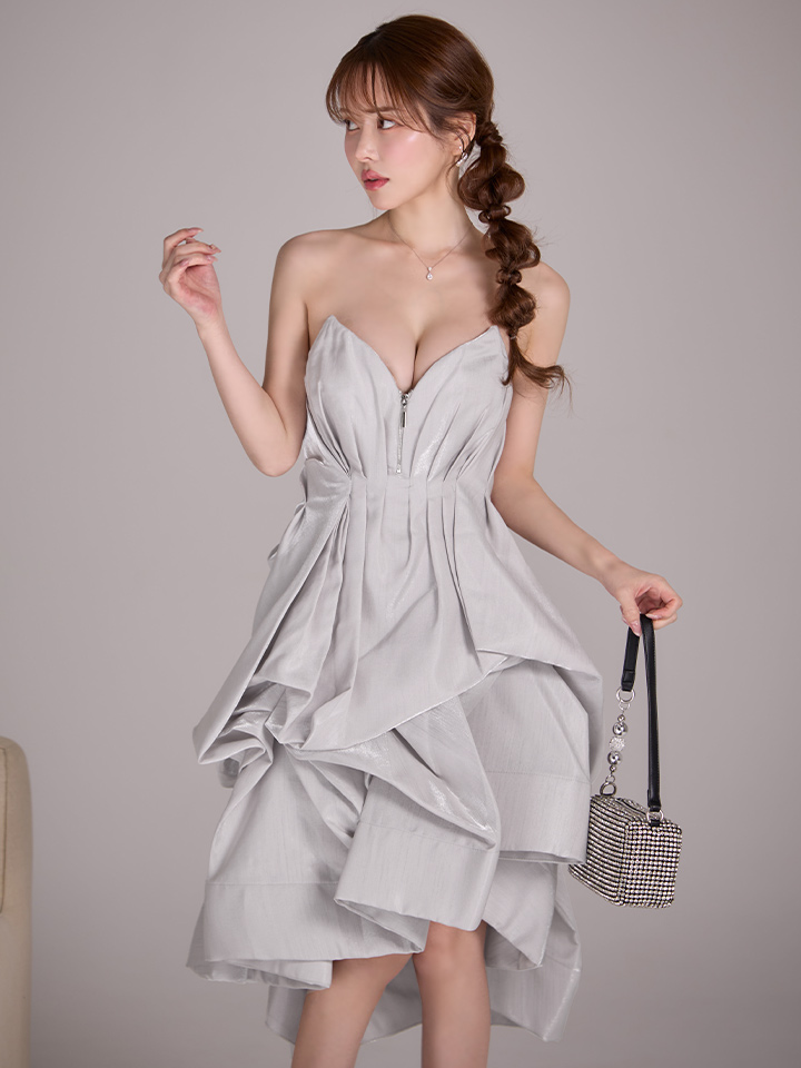 XSサイズあり【an/アン】ベア/ バストジップ/ タック/ 変形ヘム/ フレア/ ミディアムドレス/ キャバドレス[OF05]