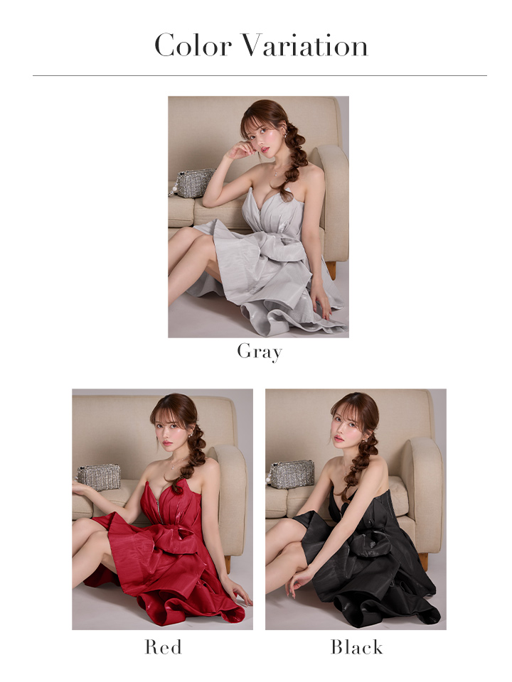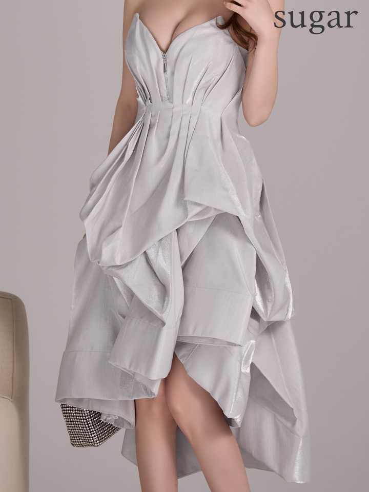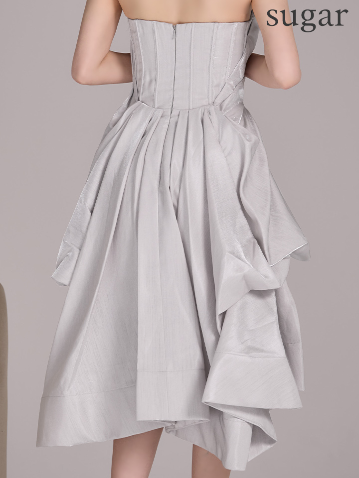 前後差のある裾ラインが360度美しいシルエットを演出し、デコルテ周りをスッキリ見せるベアデザインはアクセサリー映えも◎