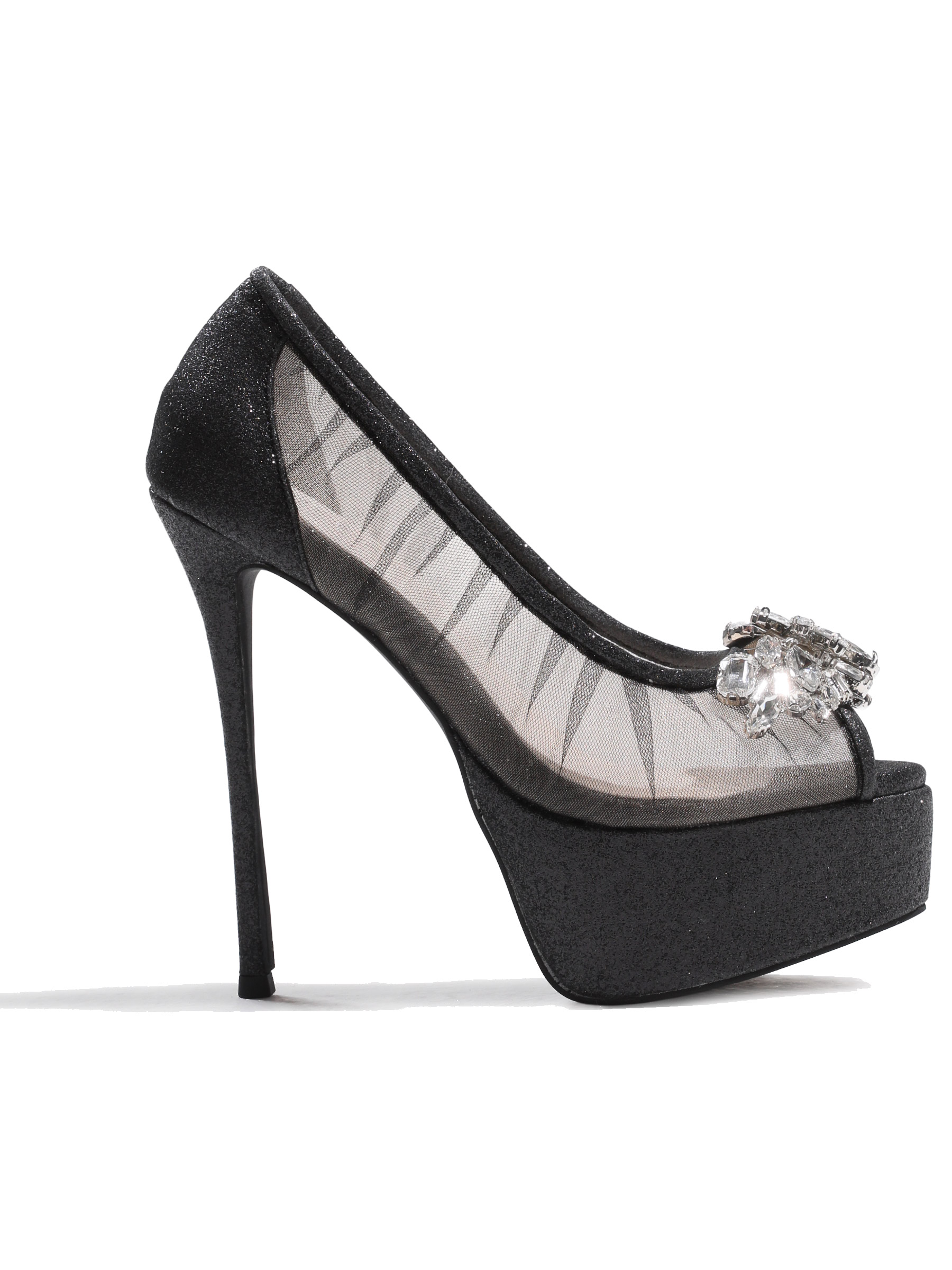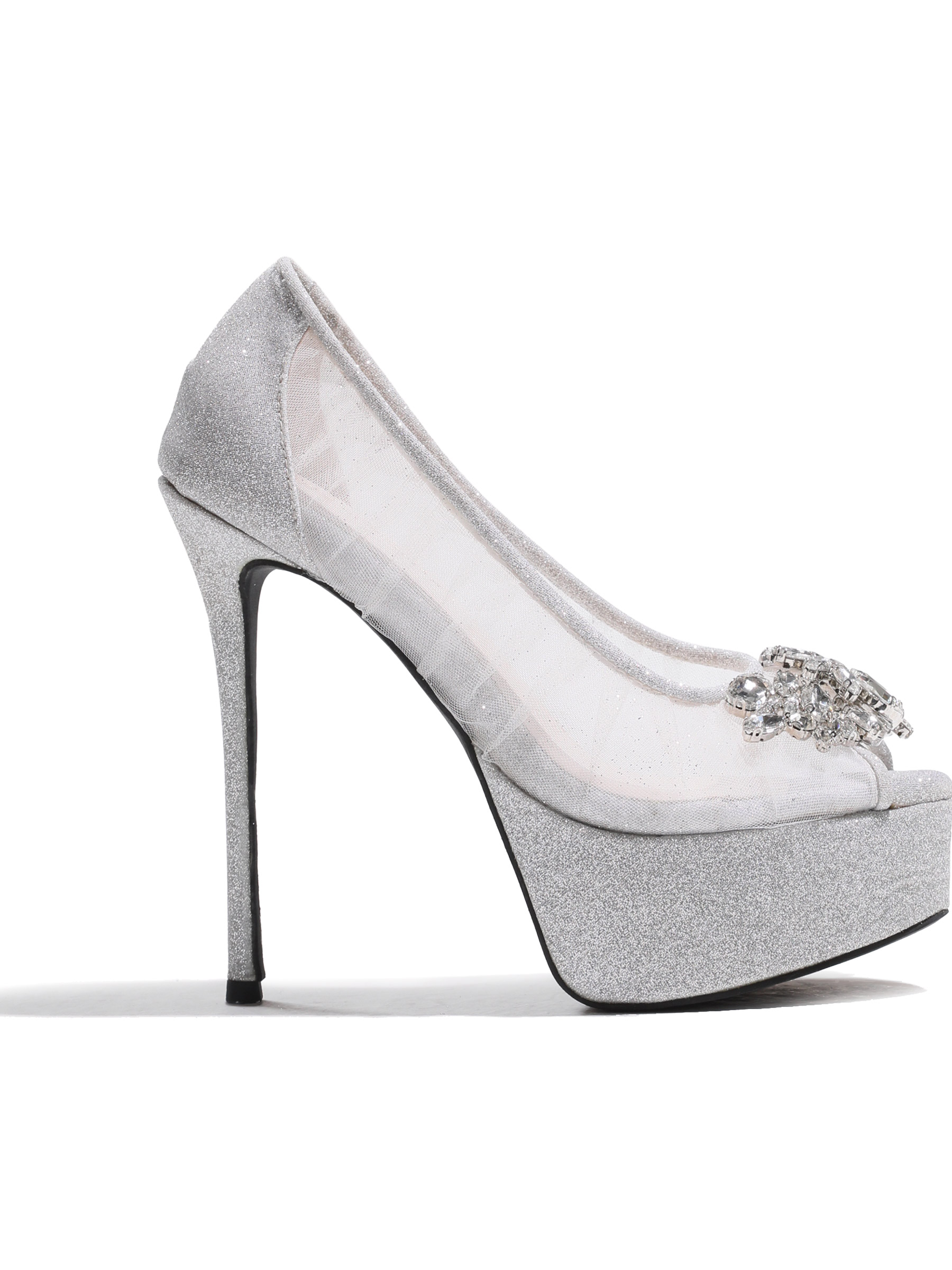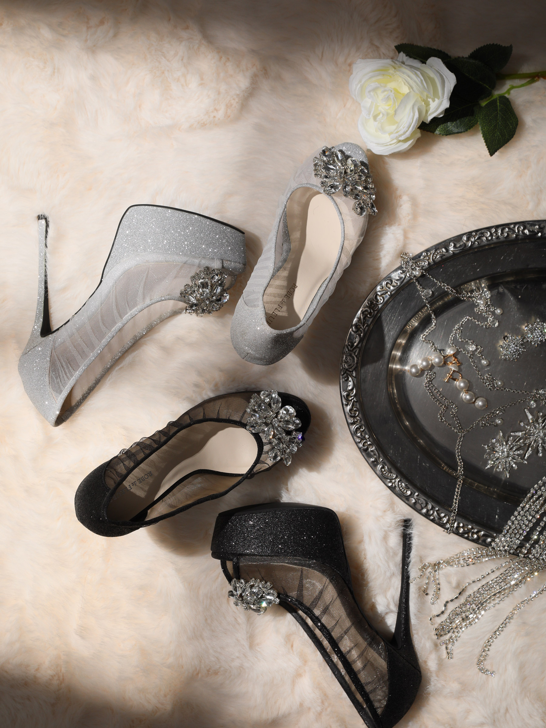 つま先にあしらわれたクリアなラインストーンと、繊細な透け感のあるメッシュ素材が、最高級の輝きをプラスします。