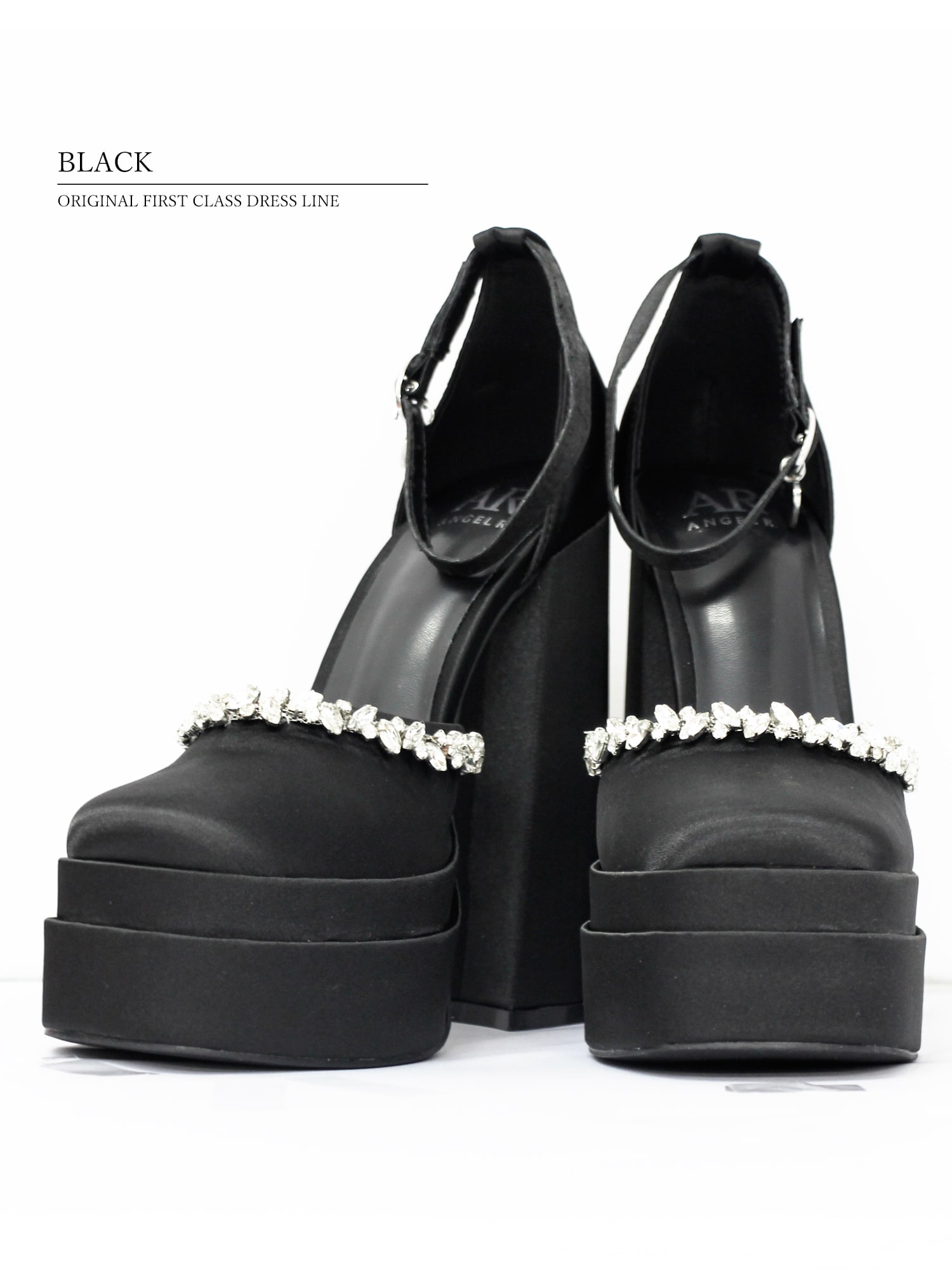 甲にあしらったビジューラインが輝く、サテン素材のラグジュアリーハイヒールパンプス。