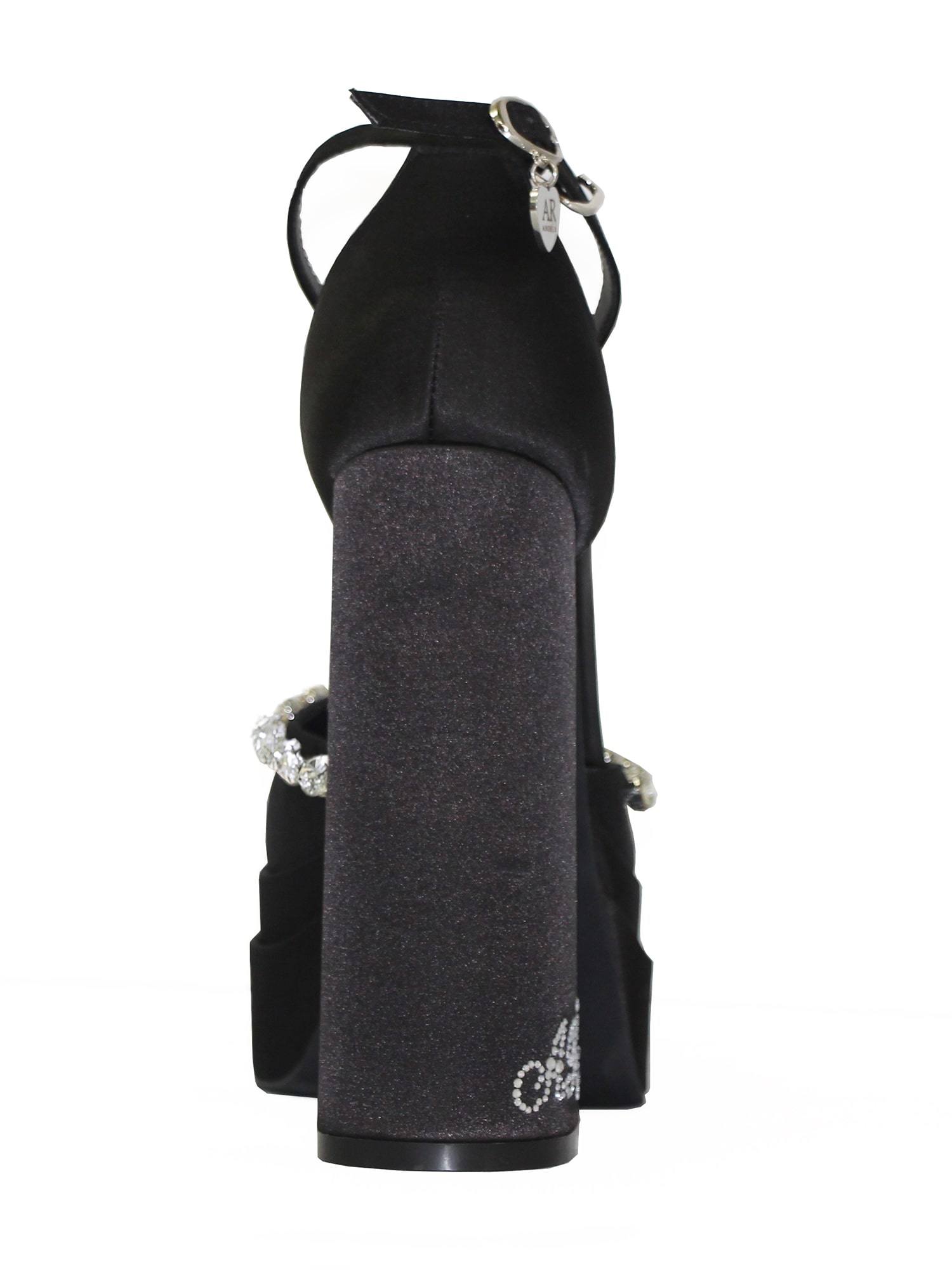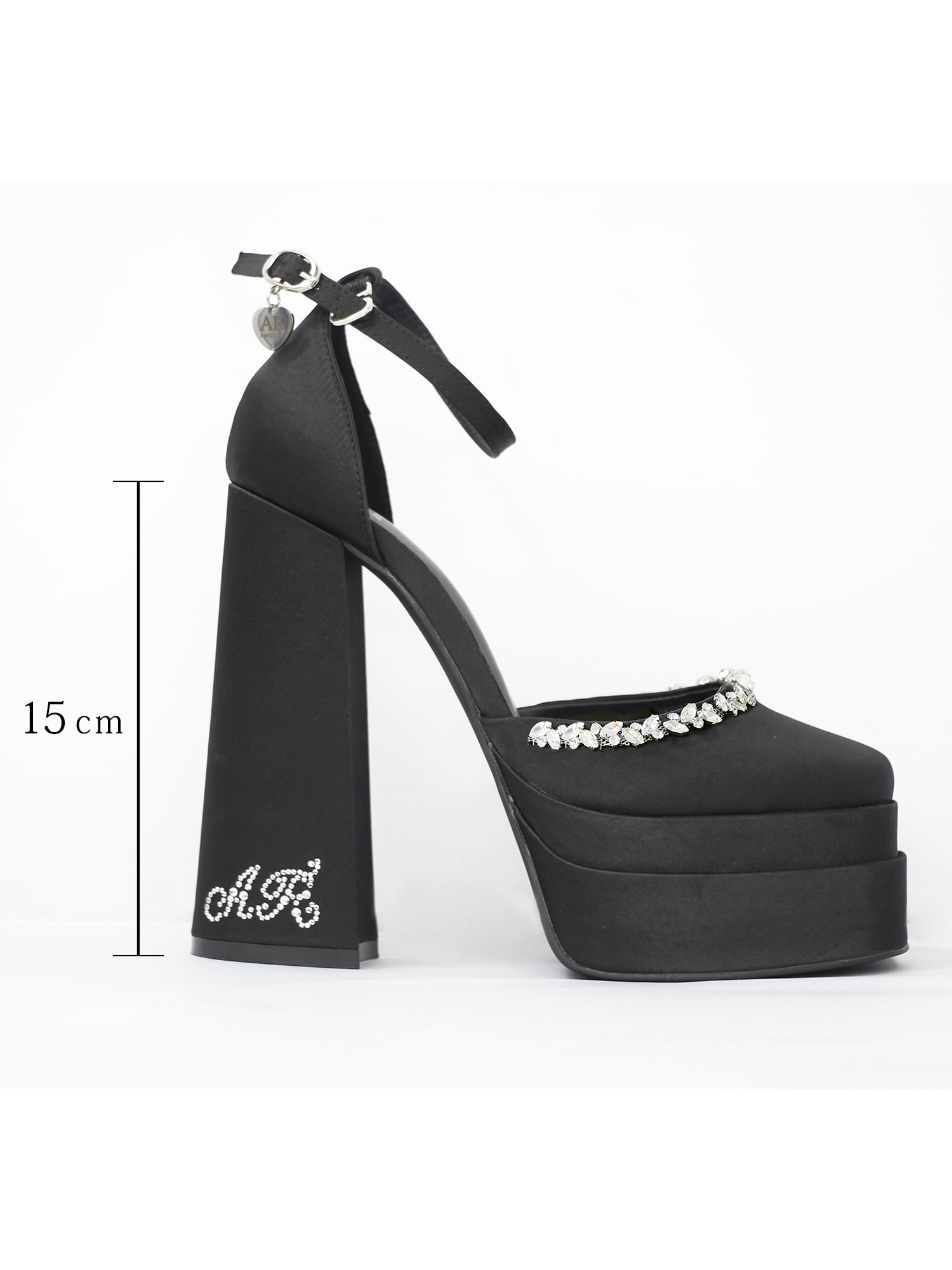 15cmヒールと厚底ソールで美脚効果を高めつつ、側面にはロゴストーン、ストラップにはハートチャームをプラス。