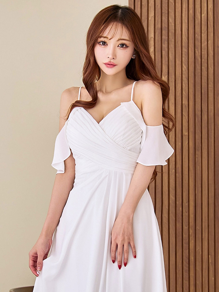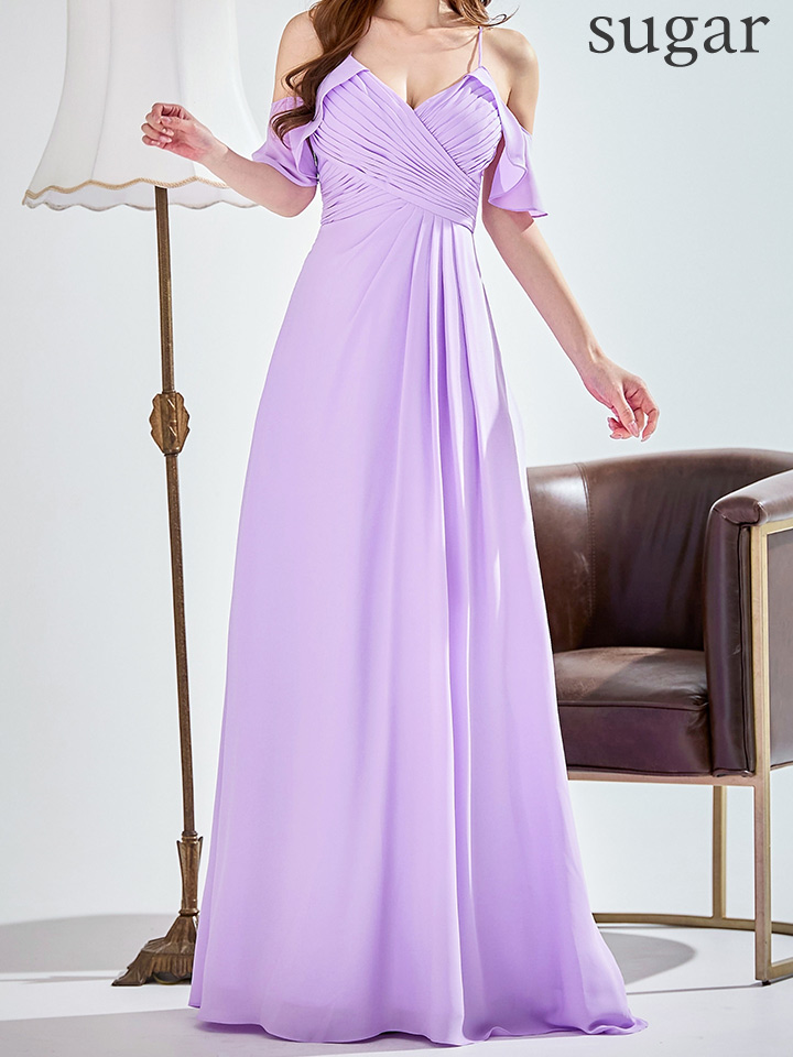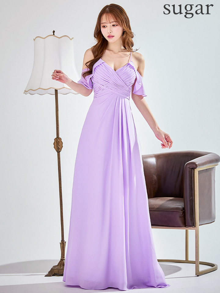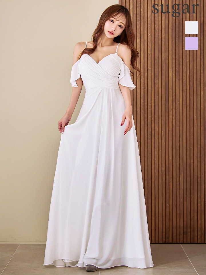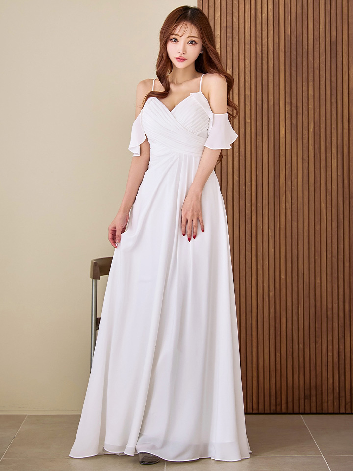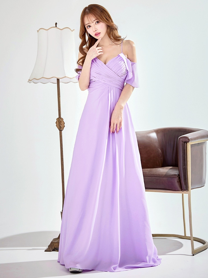 Lサイズあり【UNA VALERIE / ウナヴァレリェ】シンプル/ ワンカラー/ タック/ オフショル/ キャミソール/ フレア/ Aライン/ ロングドレス/ キャバドレス[OF05] [V60217L-LV-S2512]