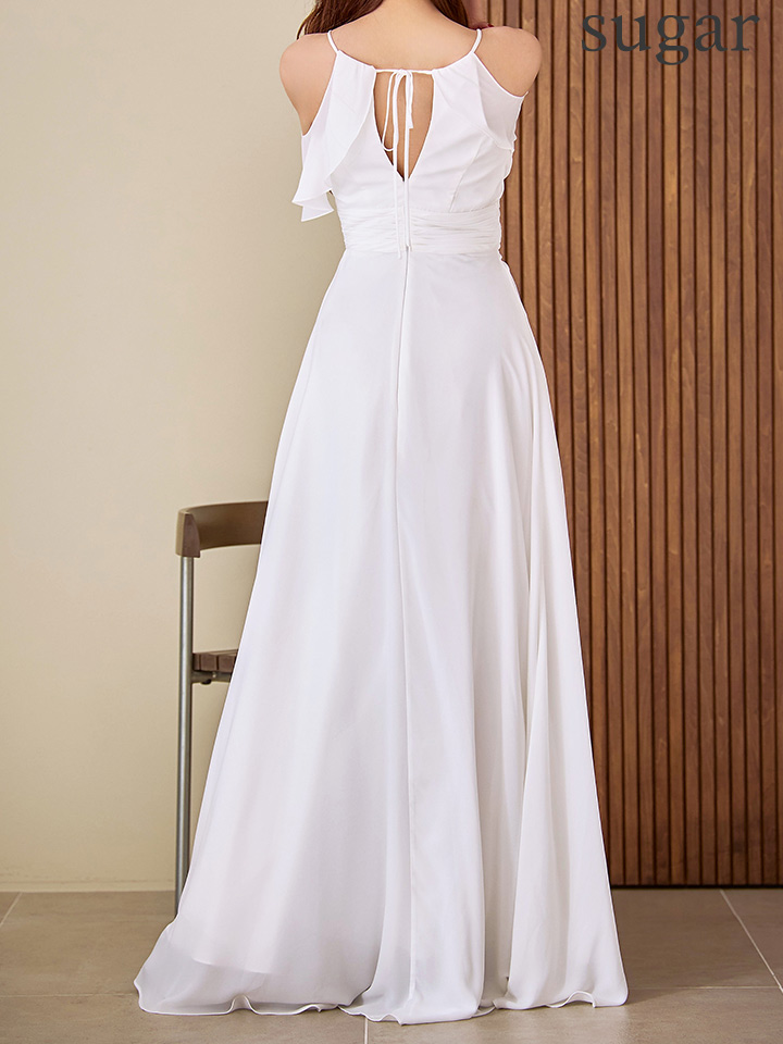動くたび揺れるフリルスリーブが上品なワンカラーフレアロングドレス♡