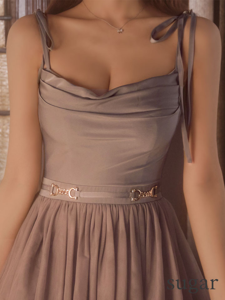 デコルテを美しく見せる柔らかなドレープネックラインと、ウエストのゴールド金具が輝く。