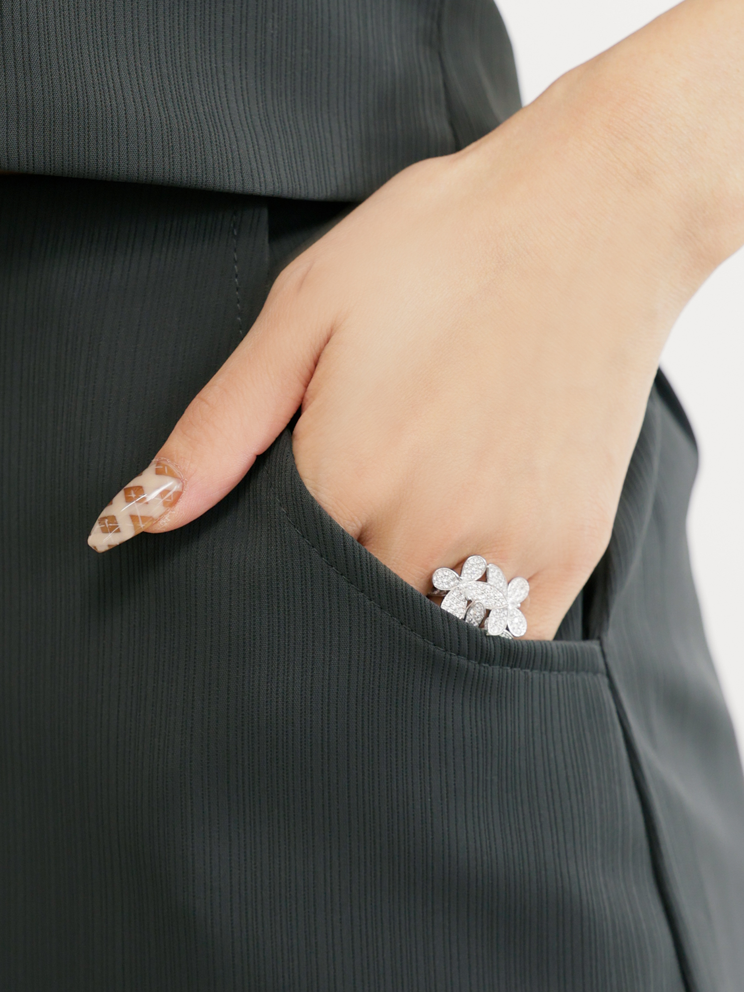 トップスの装飾が上品な存在感を放ち、フェミニンな雰囲気を演出。