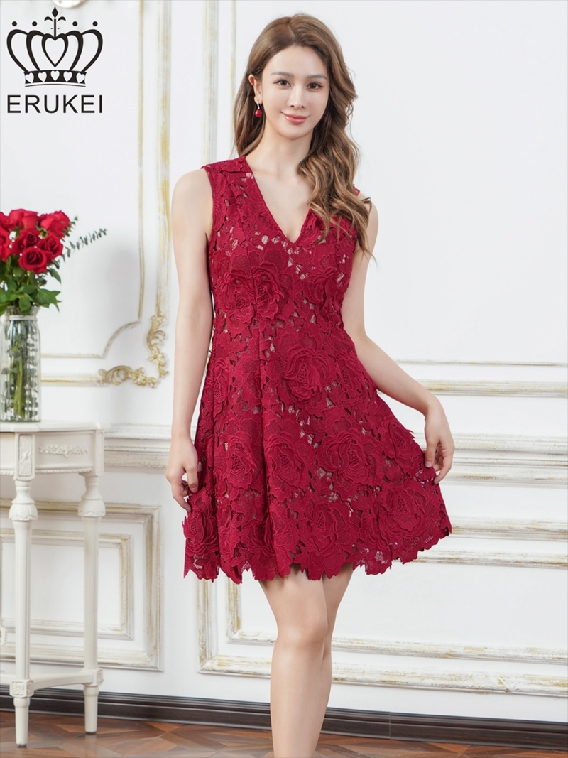 - > XS-Lサイズあり【ERUKEI エルケイ】フラワーレース/ 総レース/ ノースリーブ/ Vネック/ フレア/ Aライン/ ワンピース/ ミニドレス/ キャバドレス[OF2]
