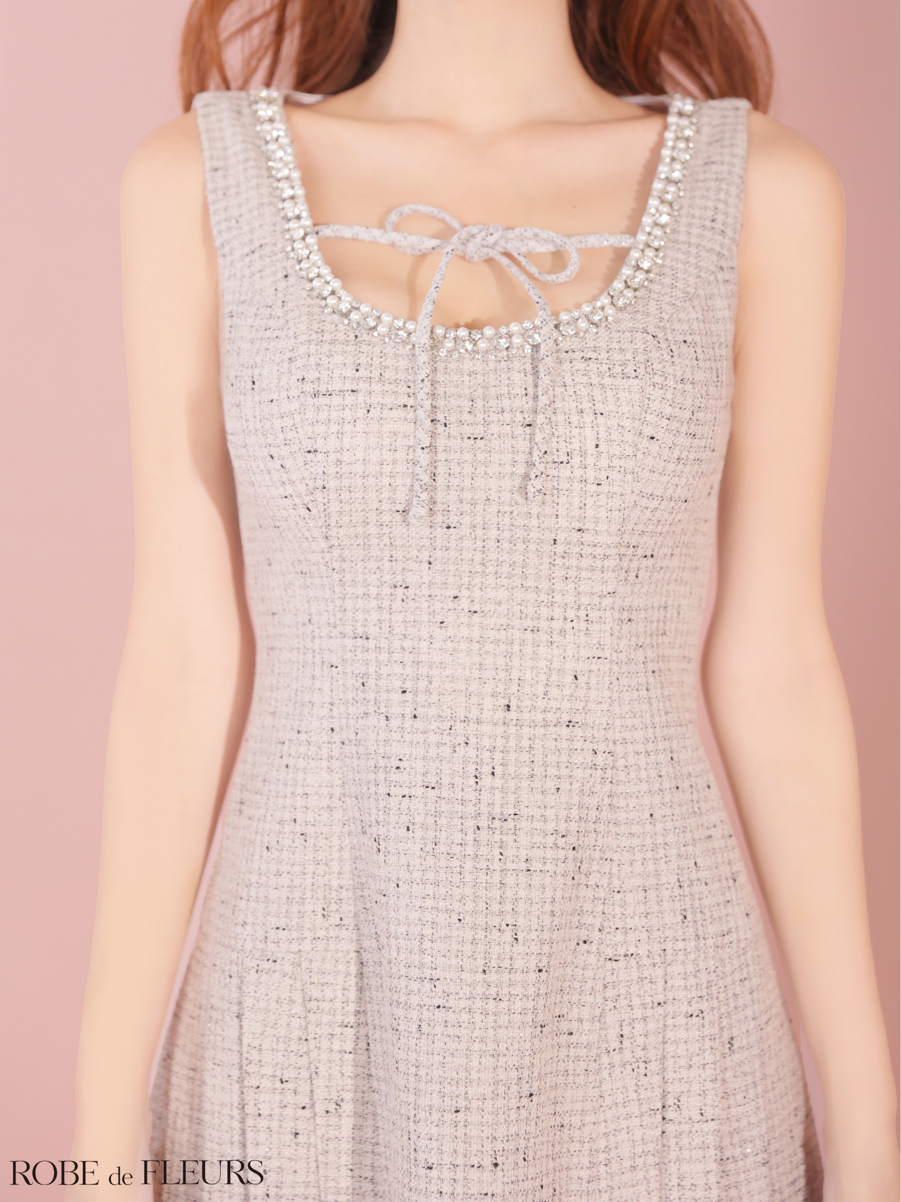 上品なきらめきを放つラメツイード素材を使用した、クラシックで洗練されたミニドレス。