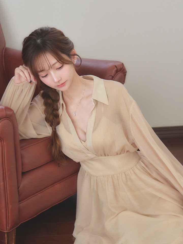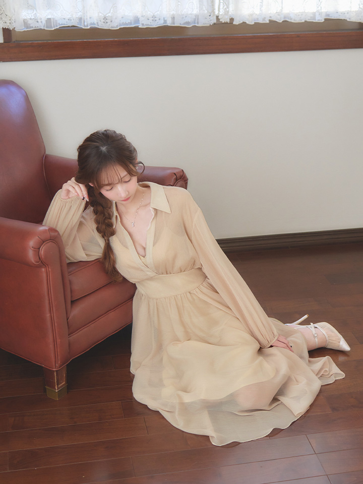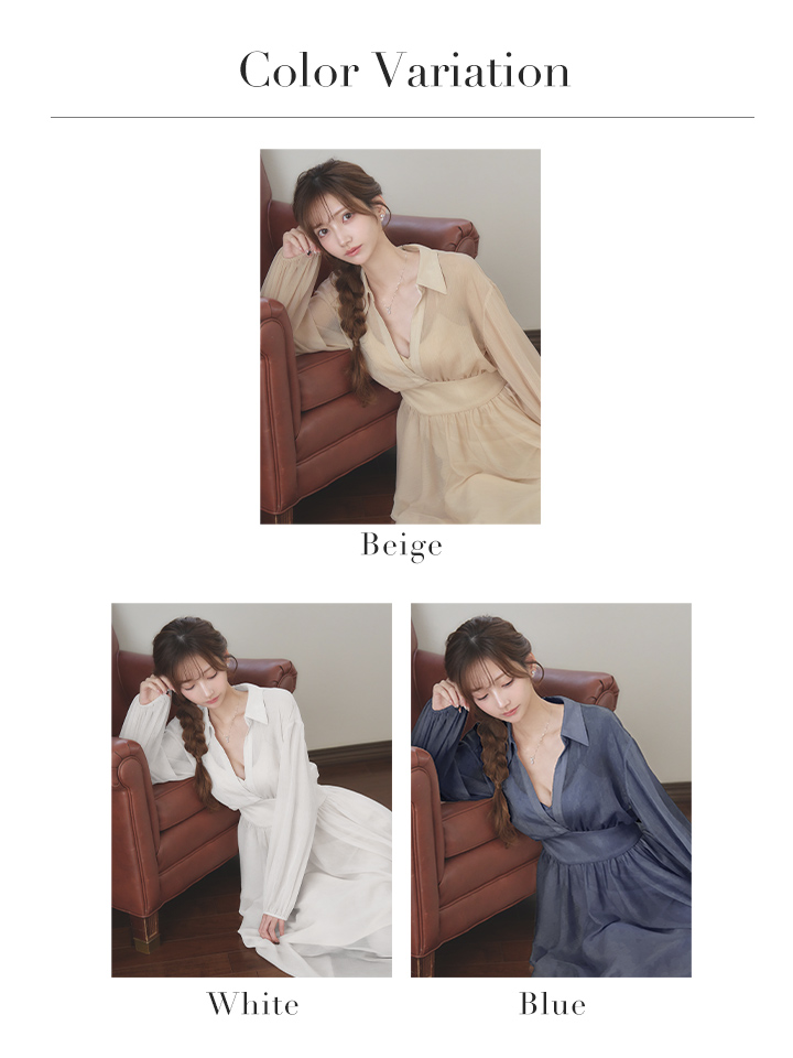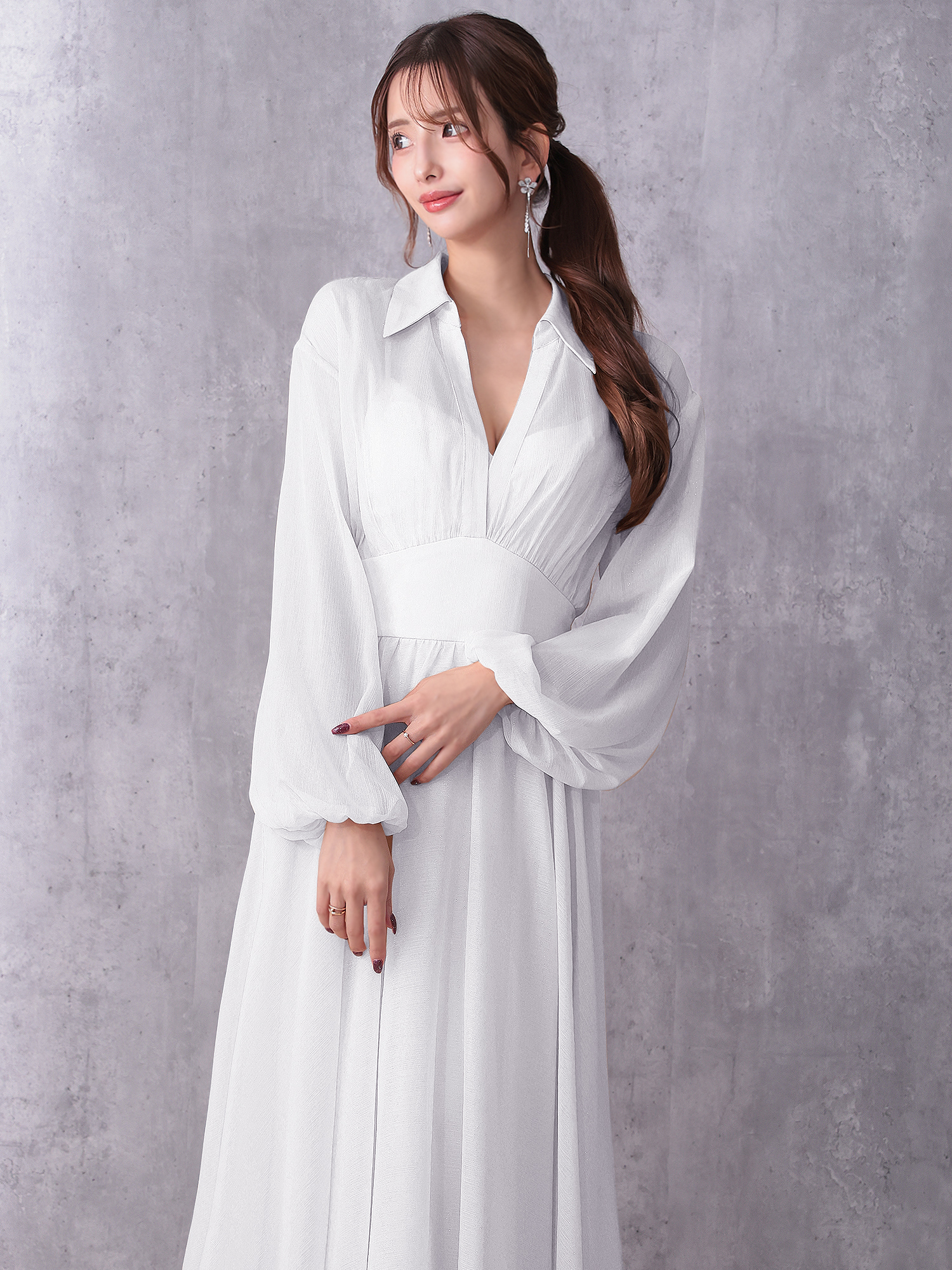 XSサイズあり【Veautt/ヴュート】【OF05】 ロングスリーブ/ ウエストマーク/ カラー/ フレア/ ミディアムドレス/ キャバドレス [VT082532-W-S251216]