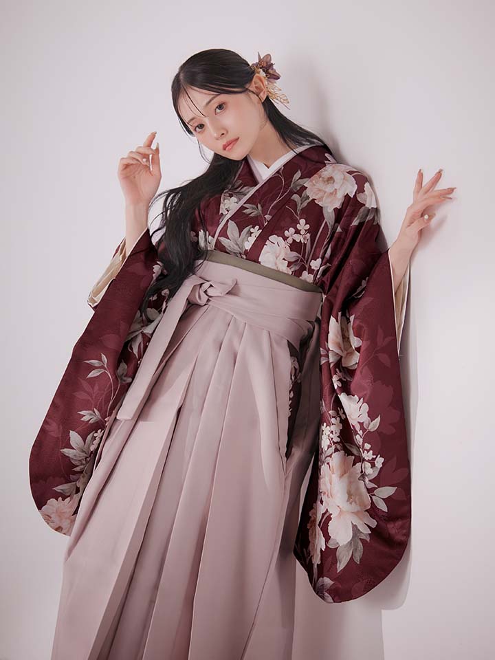 【予約商品/1月中旬発送予定】ピンク芍薬 ワインレッド二尺袖着物【卒業袴3点セット 二尺袖着物/帯/袴】 [HR-108-ok-WR-F-25MU-251220]