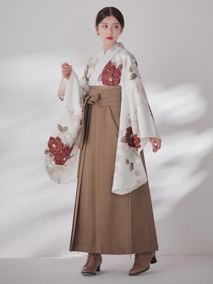 【予約商品/1月中旬発送】赤×白椿 ベージュ二尺袖着物【卒業袴3点セット 二尺袖着物/帯/袴】 [HR-114-ok-BE-F-25EN-251220]