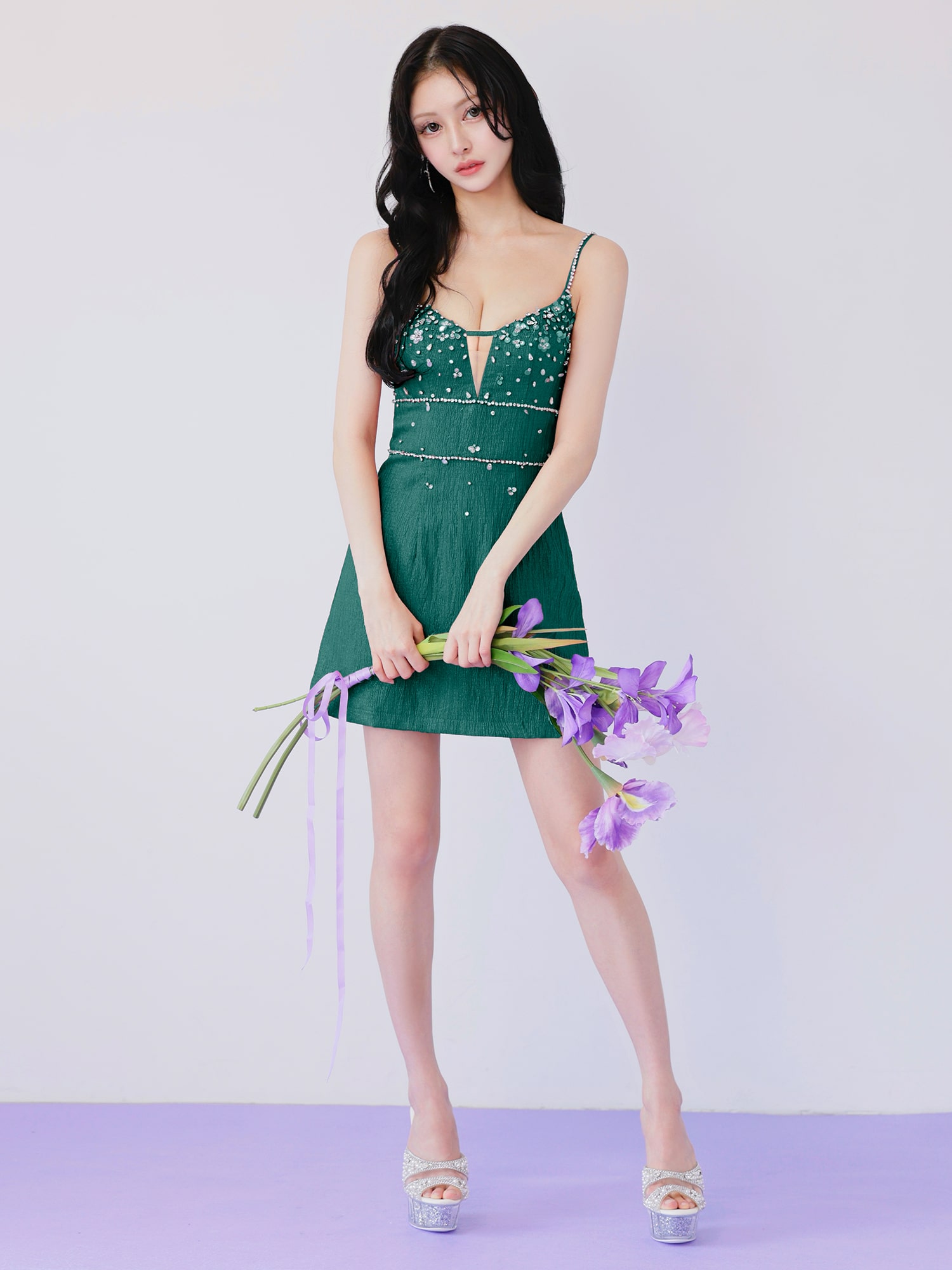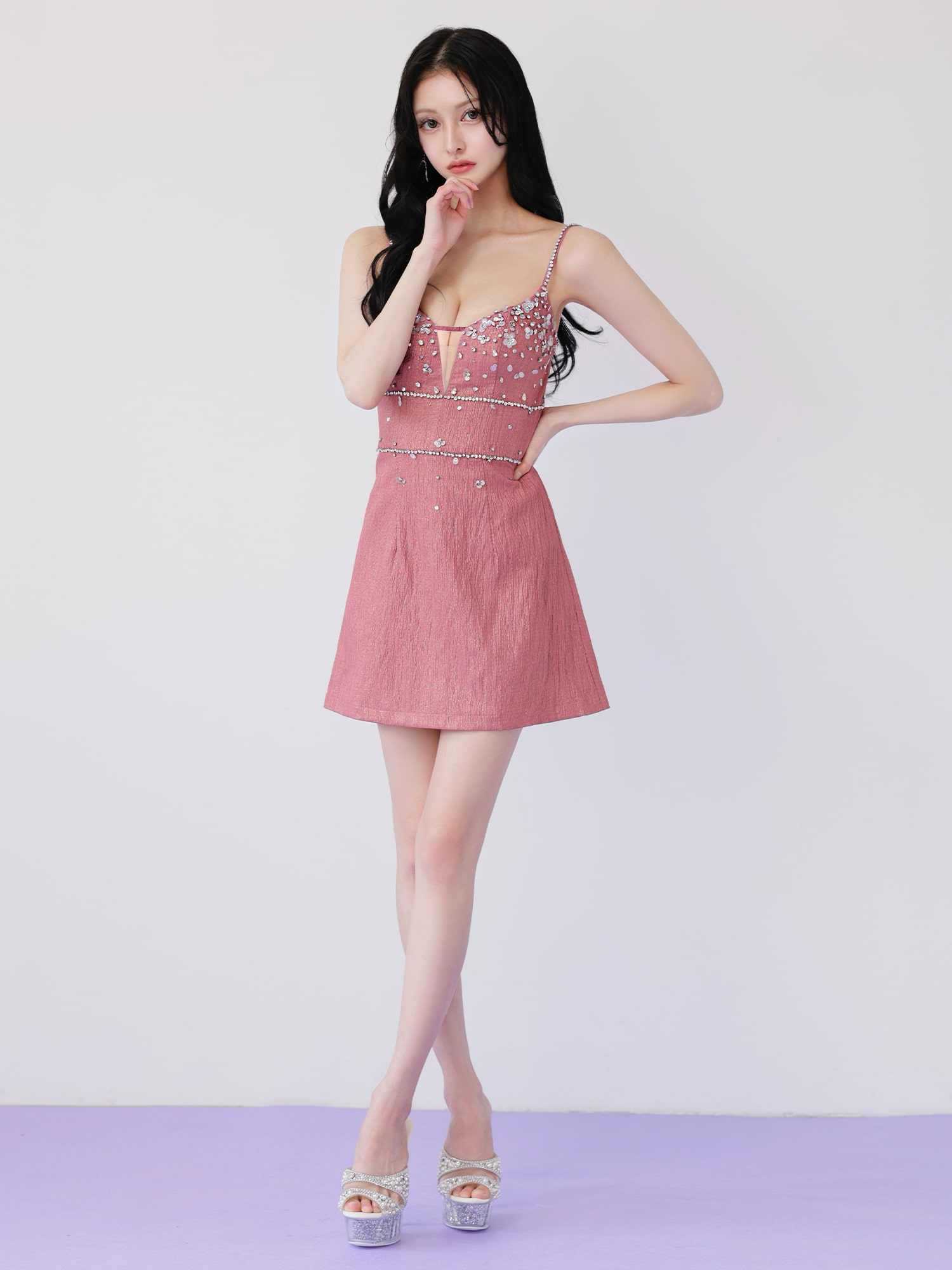 シンプルなミニ丈に上品な輝きを添え、特別な夜に映える一着です。