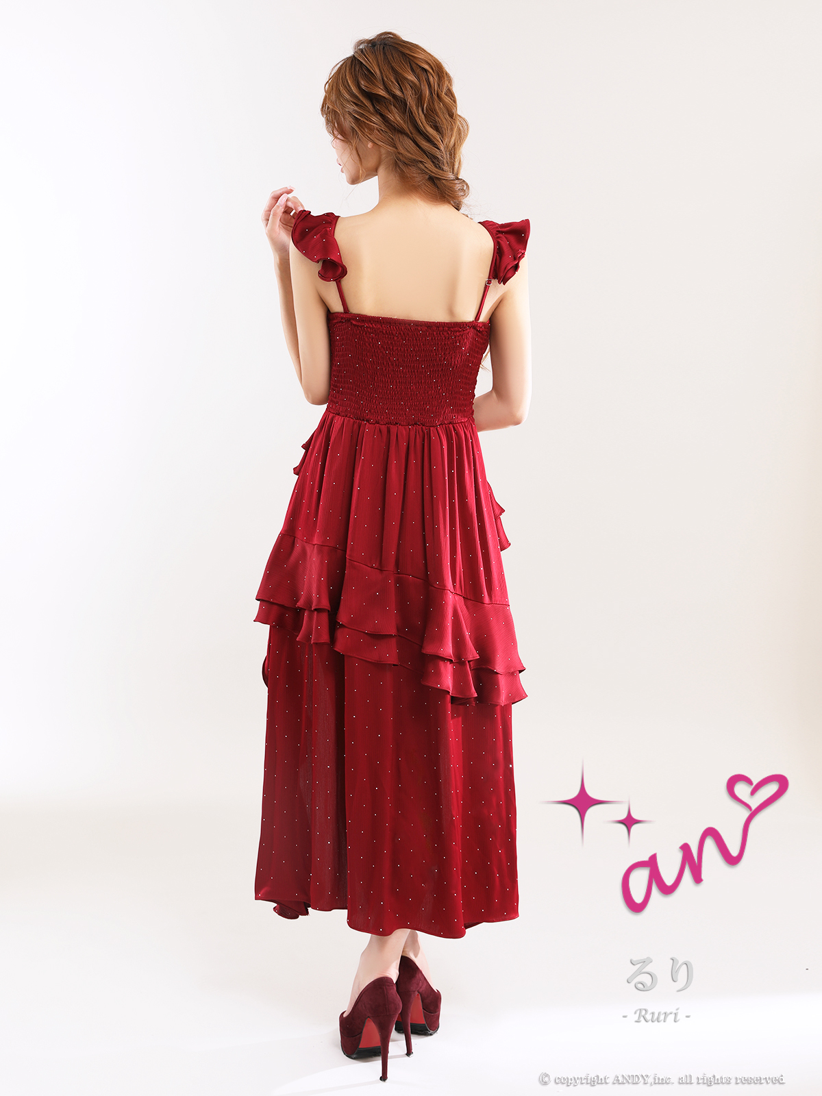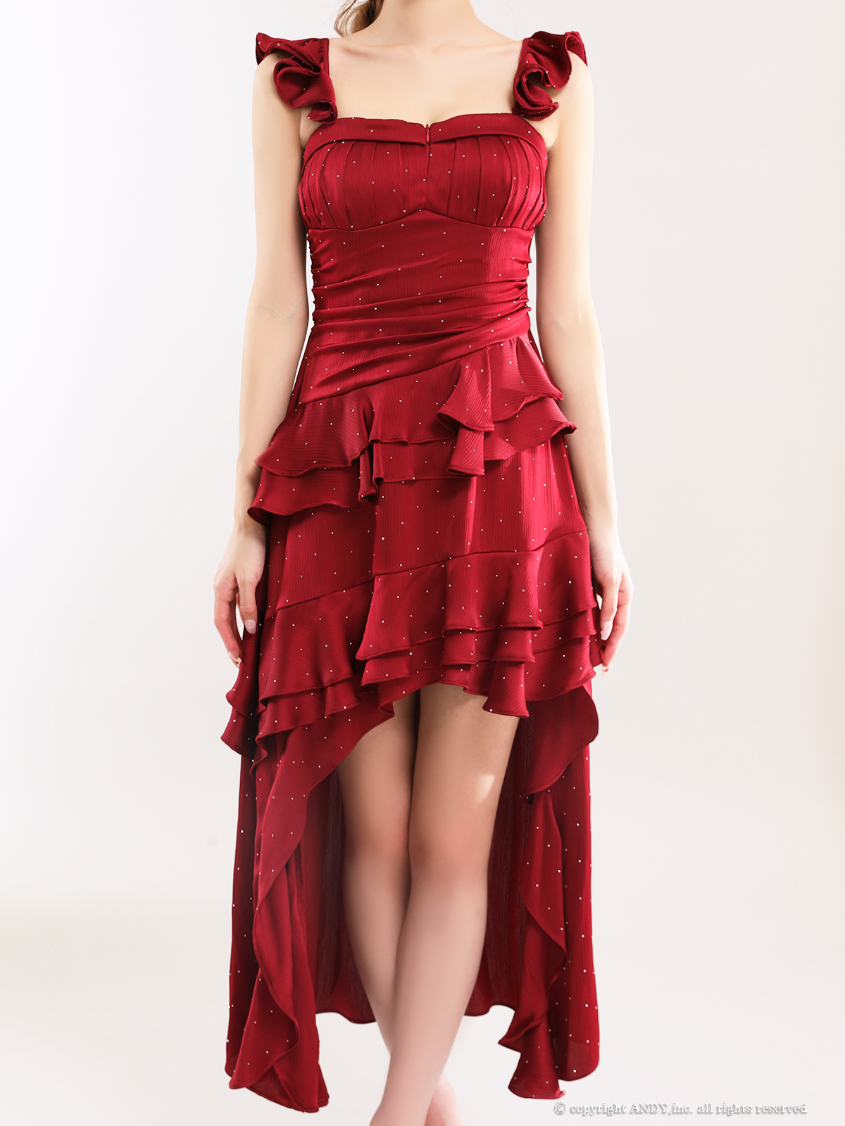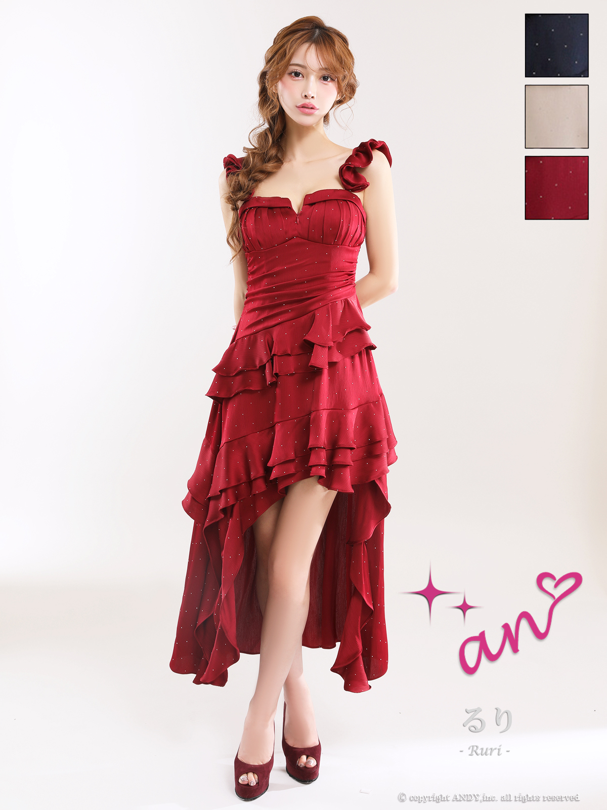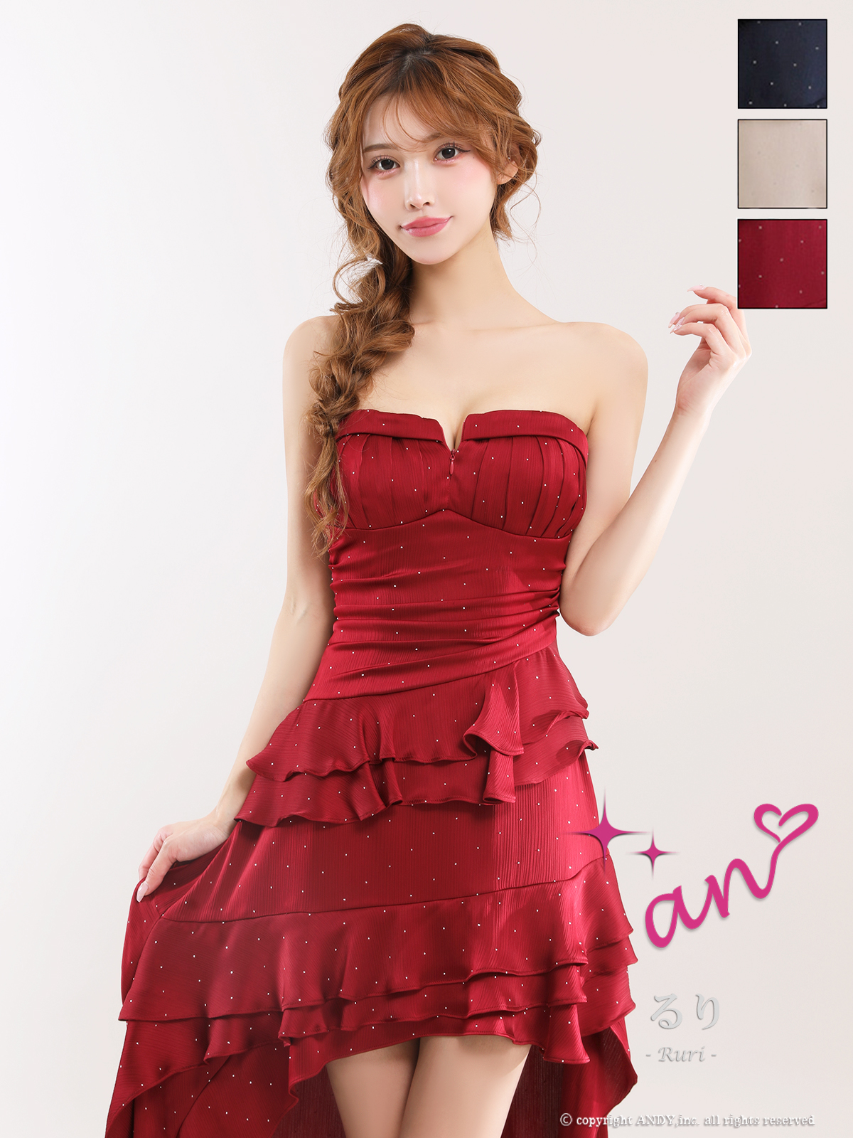 - > XSサイズあり【an /アン】ラインストーン/ フリル/ バストジップ/ ティアード/ テールカット/ キャミ/ ミディアムドレス/ キャバドレス[OF05]