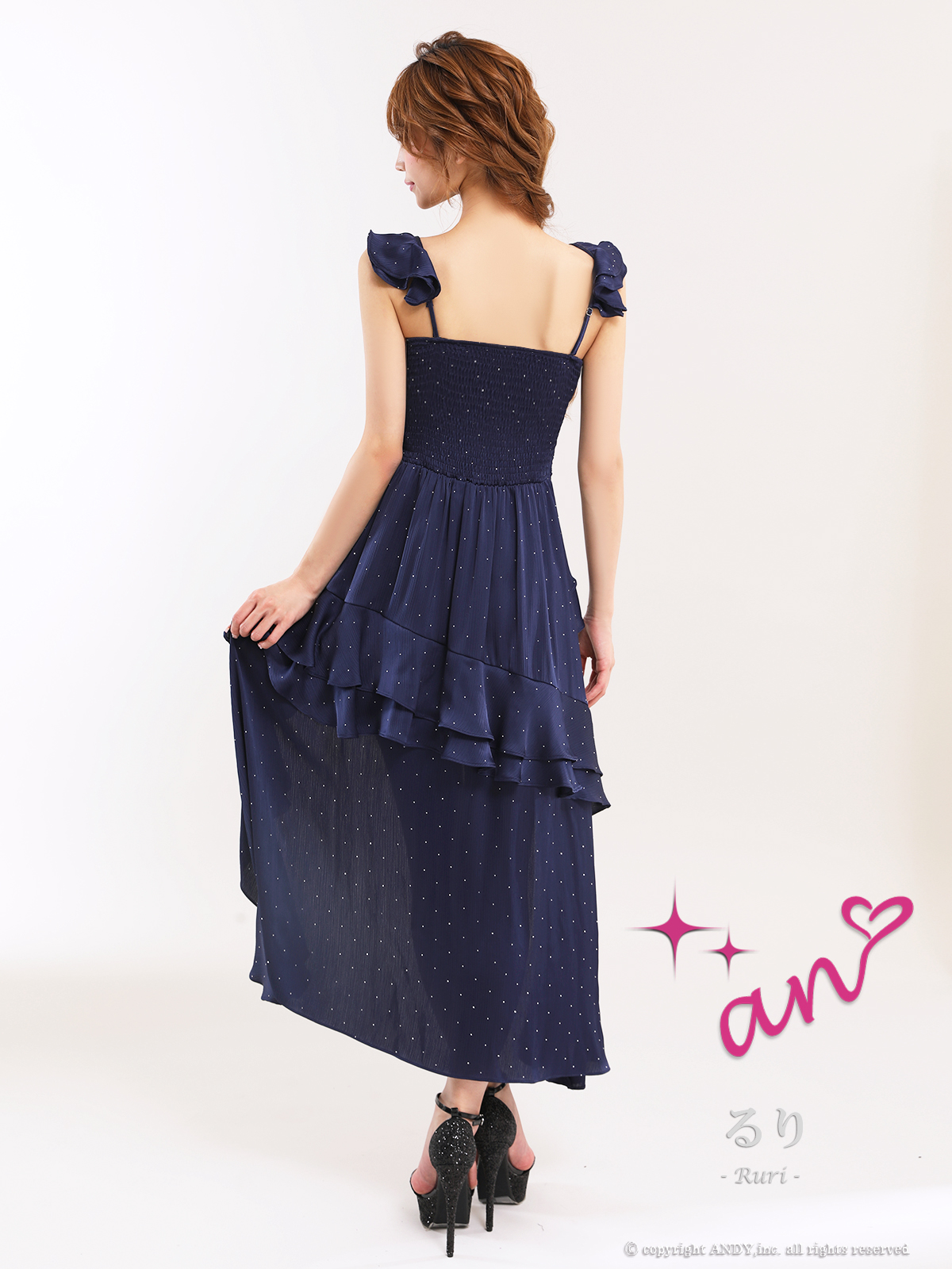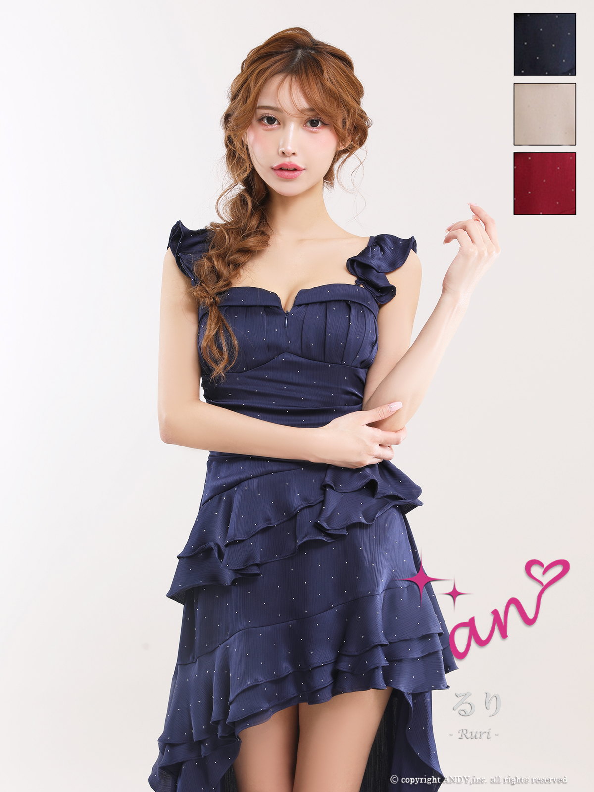 XSサイズあり【an /アン】ラインストーン/ フリル/ バストジップ/ ティアード/ テールカット/ キャミ/ ミディアムドレス/ キャバドレス[OF05] [AOC4041-NV-2512]
